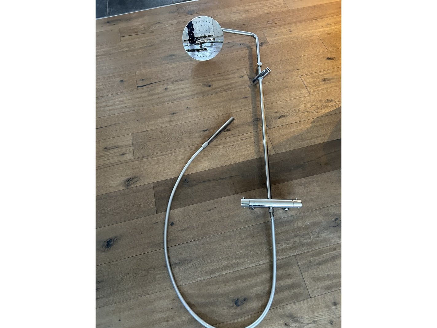 Merk: Evenes Product: Regendouche met thermostaat kraan Materiaal: Chroom Afmeting: 900 x 1200mm. Conditie: Nieuw Specificaties: Regendouche met thermostaatkraan Evenes 900 x 1200mm. hoofdouche 25 cm. diameter chroom nieuw