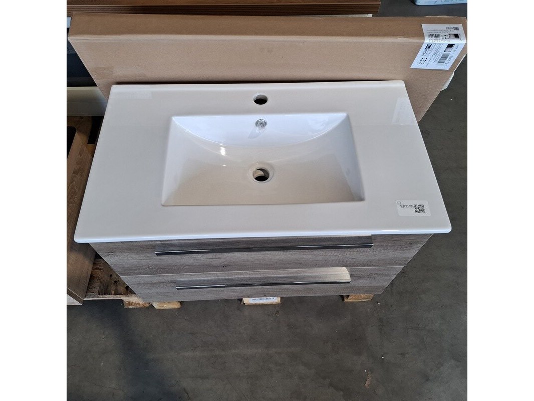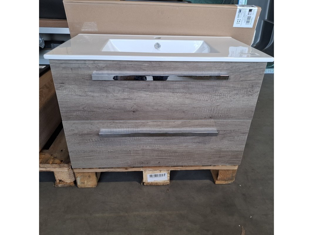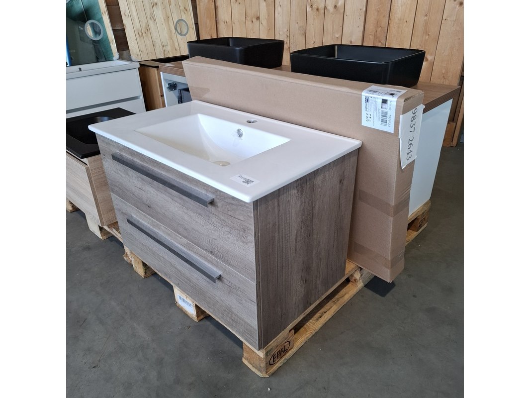 Merk: HR Badmeubelen Product: Badmeubel Kleur: Nebraska eiken Afmeting: 80x46cm Specificaties: 2 lades met softclose, chromen grepen, keramische wastafel, wit, spiegel, 80x60cm, 1 x LED balk boven, scheerspiegel met LED, met tijdsaanduiding