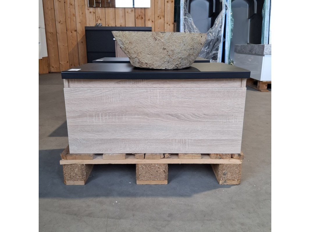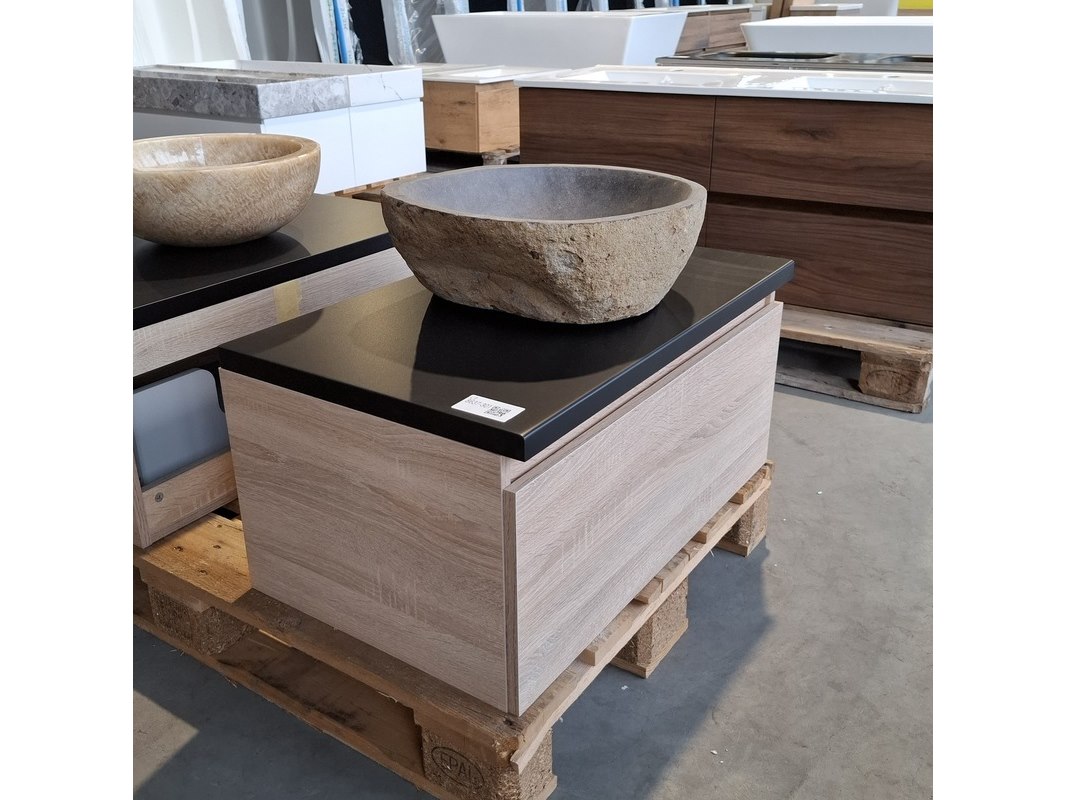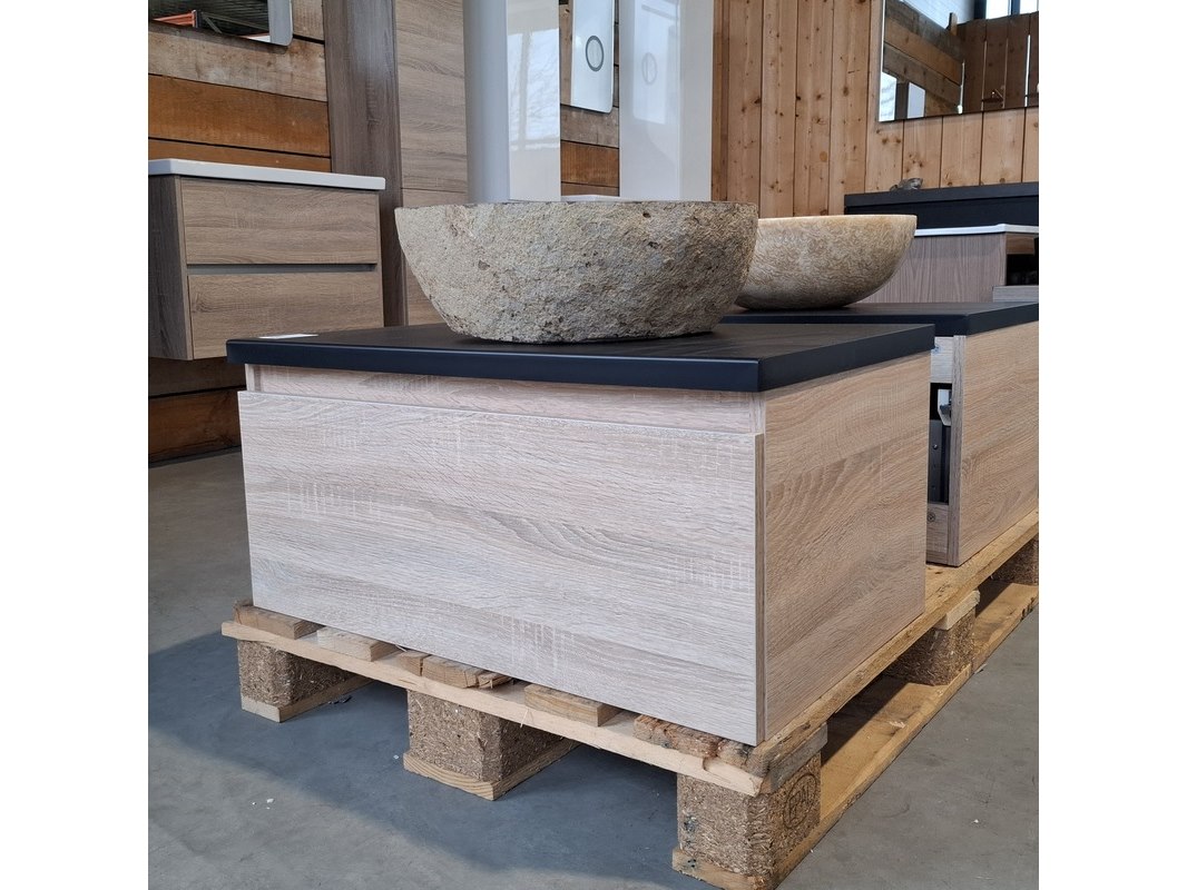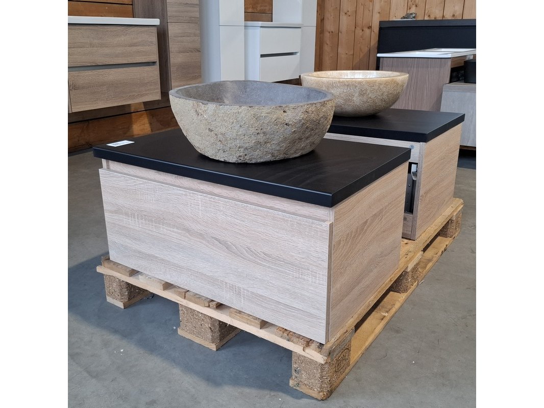 Merk: HR Badmeubelen Product: Badmeubel Kleur: Eiken Afmeting: 75x46cm Specificaties: 1 lade met softclose, met Blum lade-geleide systeem, greeploos, topblad matzwart, waskom, riverstone