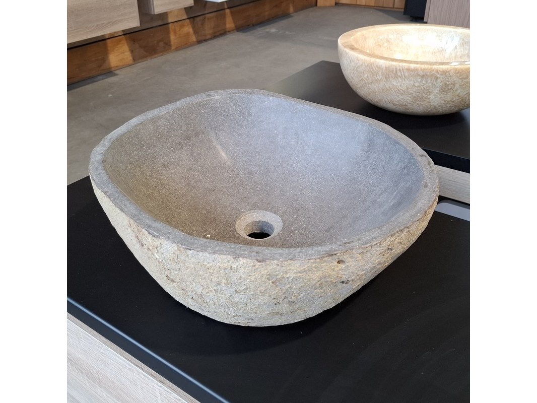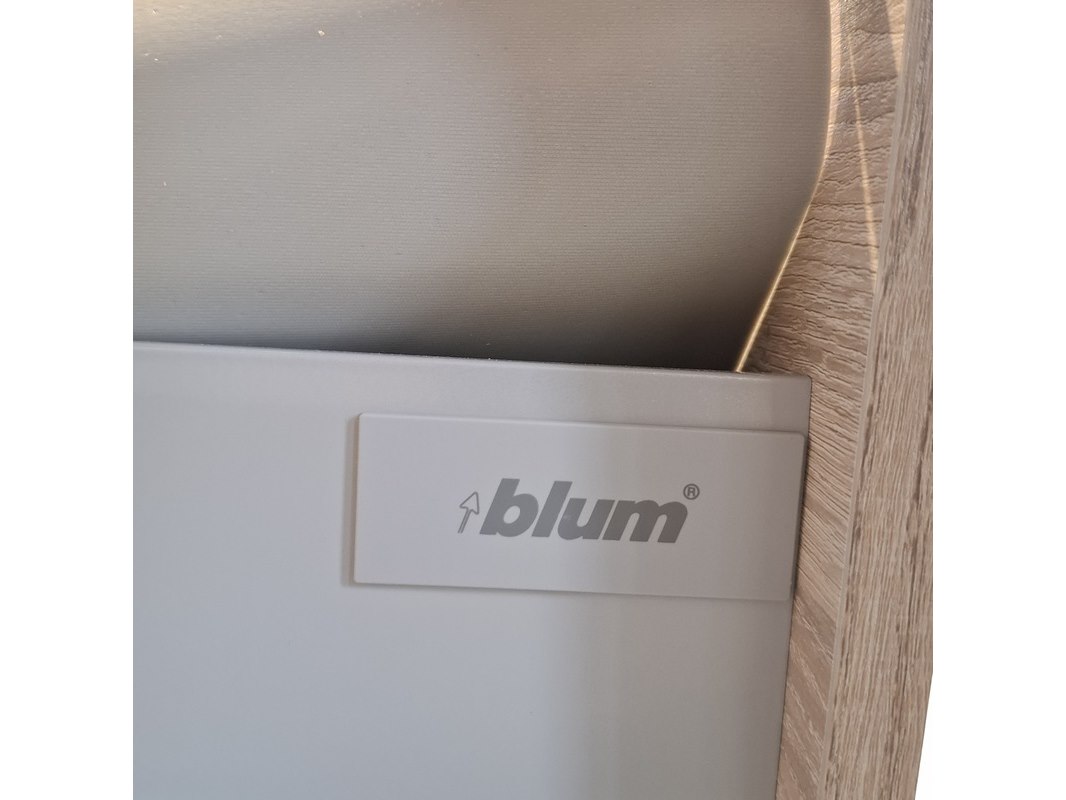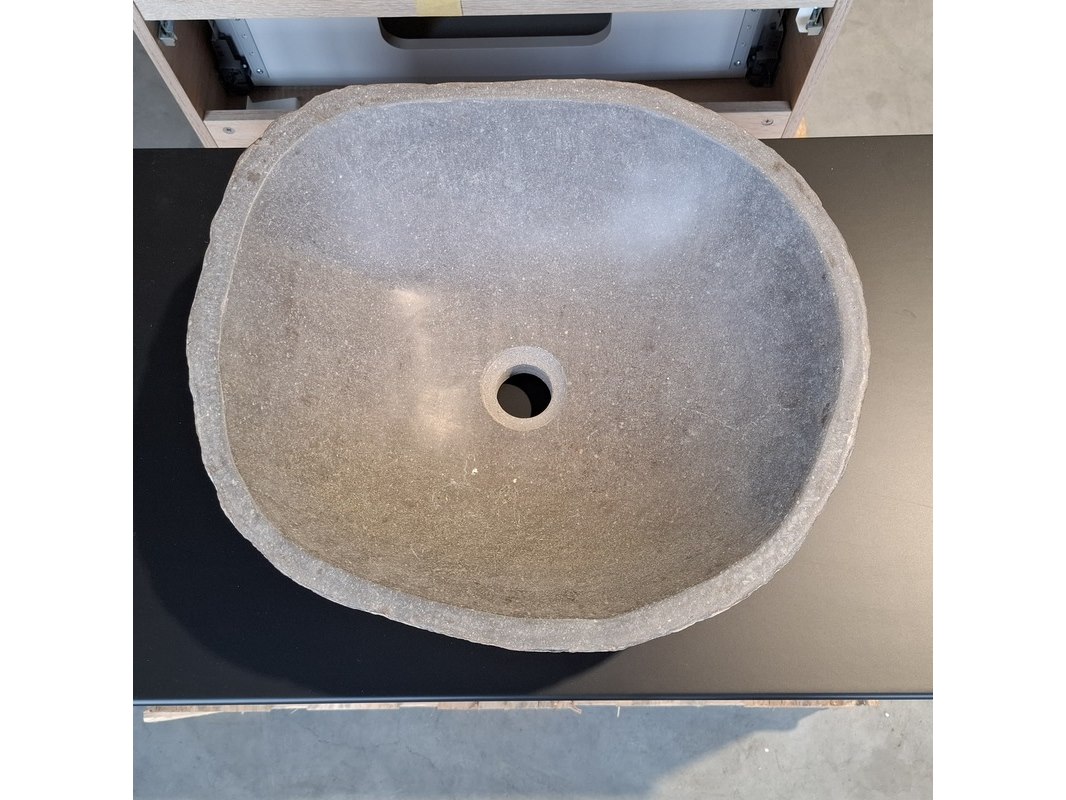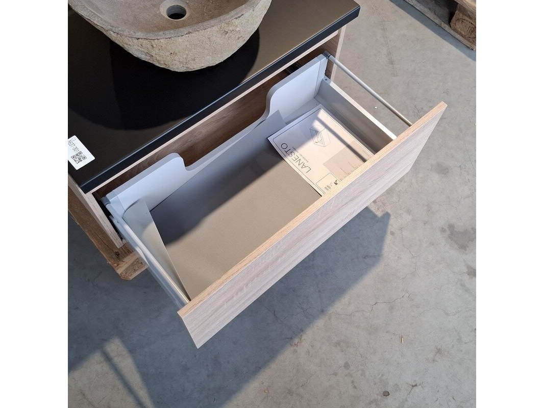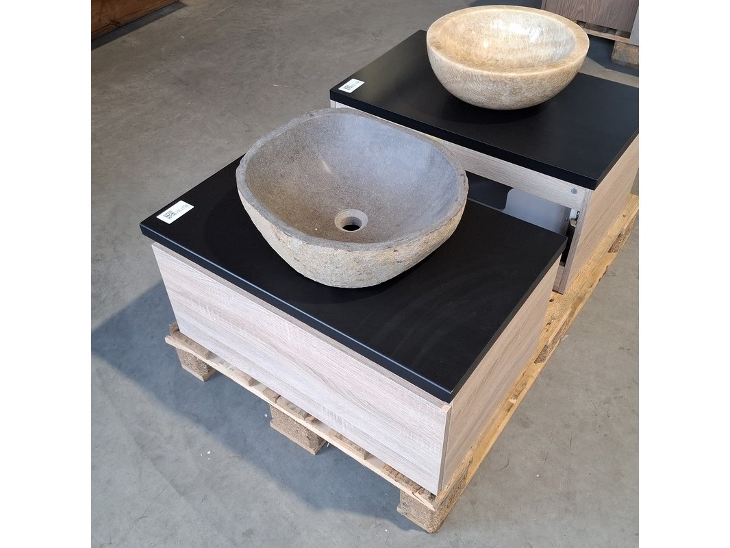 Merk: HR Badmeubelen Product: Badmeubel Kleur: Eiken Afmeting: 75x46cm Specificaties: 1 lade met softclose, met Blum lade-geleide systeem, greeploos, topblad matzwart, waskom, riverstone