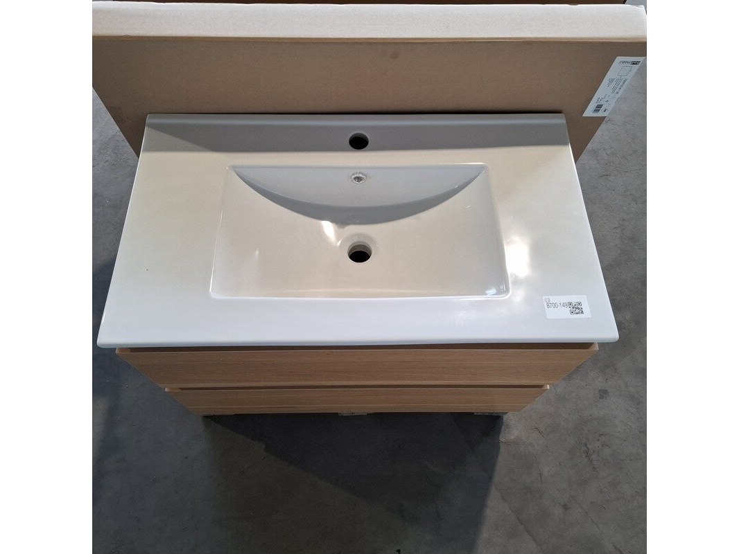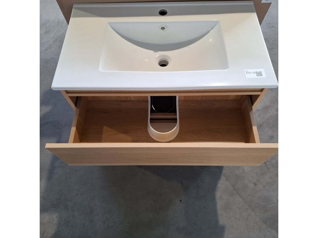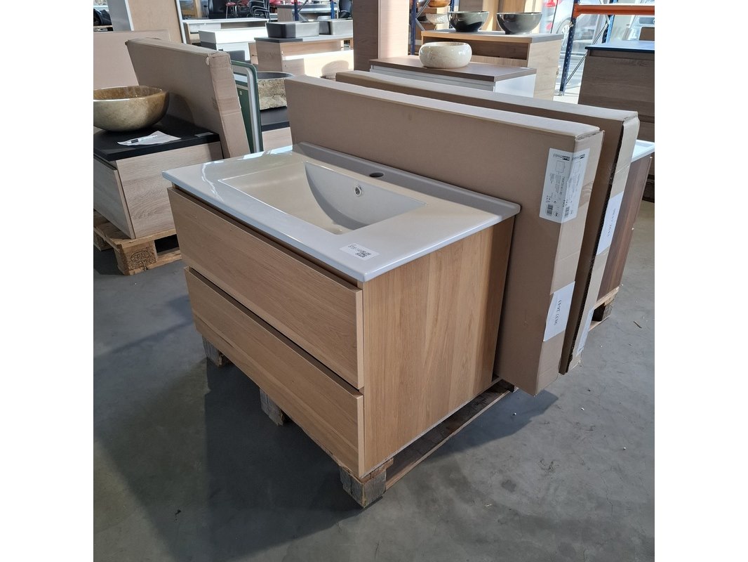 Merk: HR Badmeubelen Product: Badmeubel Kleur: Eiken Afmeting: 80x46cm Specificaties: 2 lades met softclose, greeploos, keramische wastafel, wit, spiegel, 80x60cm, 1 x LED balk boven, scheerspiegel met LED, met tijdsaanduiding