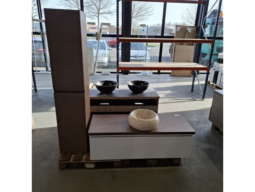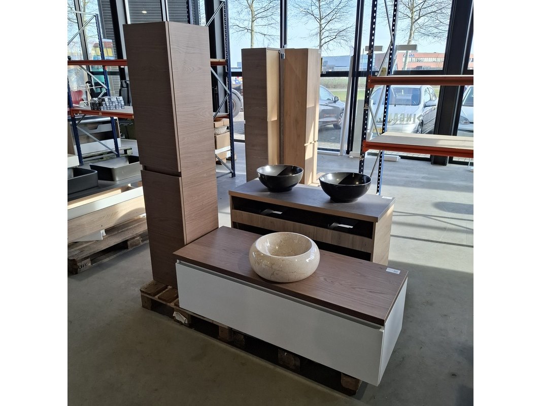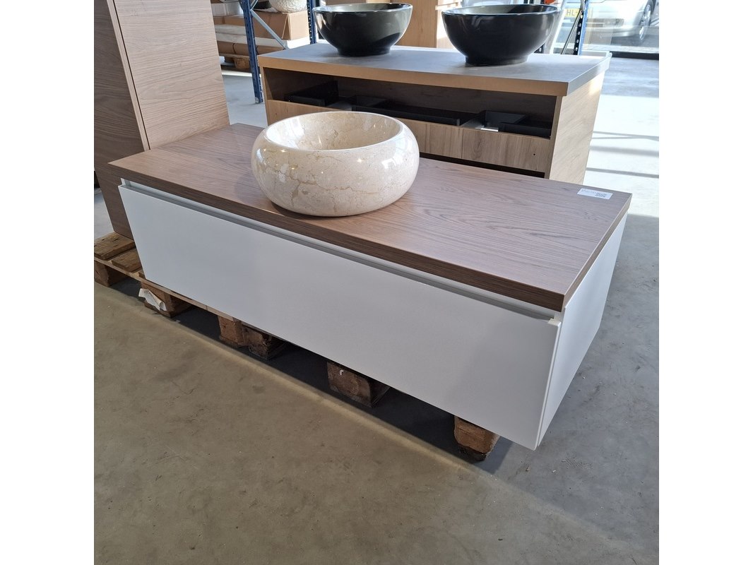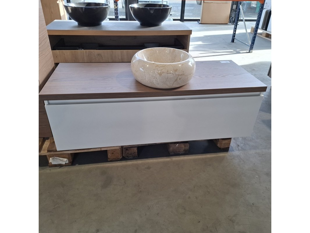 Merk: HR Badmeubelen Product: Badmeubel Kleur: Glans wit Afmeting: 130x50cm Specificaties: 1 lade met softclose, greeploos, topblad, honey, ronde marmeren waskom, 1 hoge kast, 160x35x35cm, 2 deurtjes met softclose, greeploos
