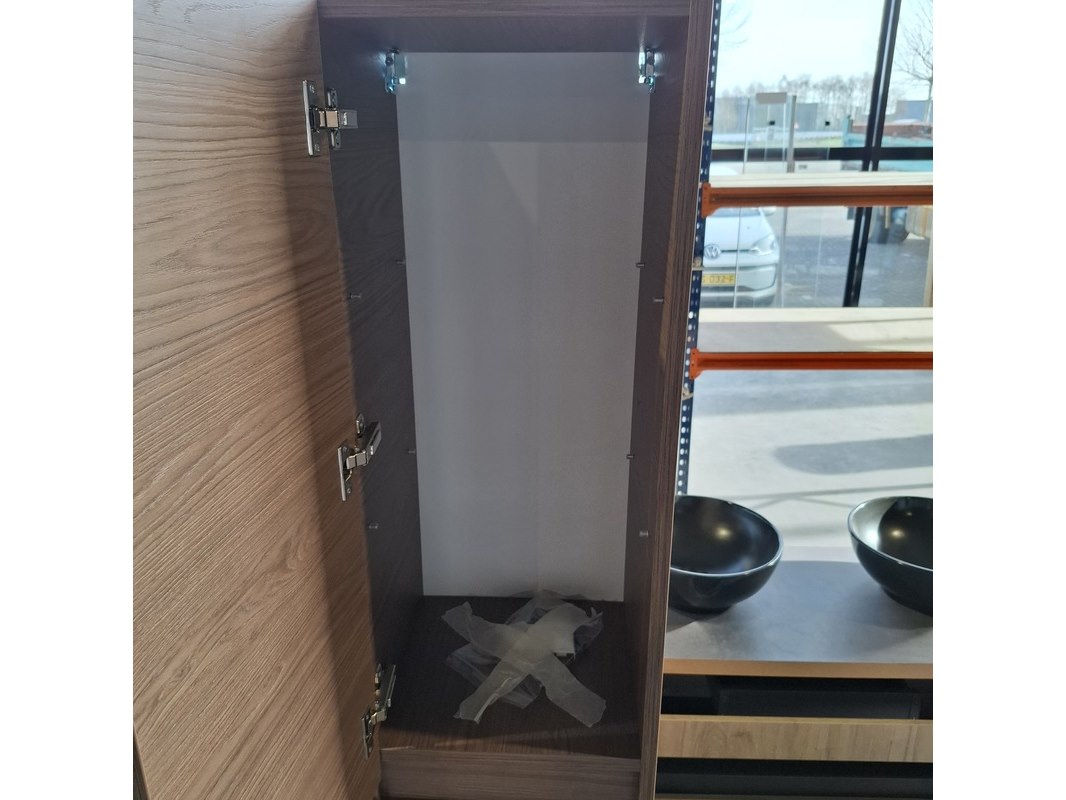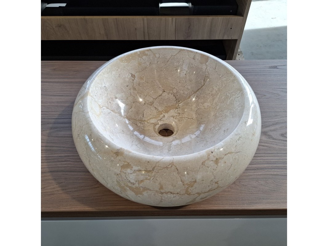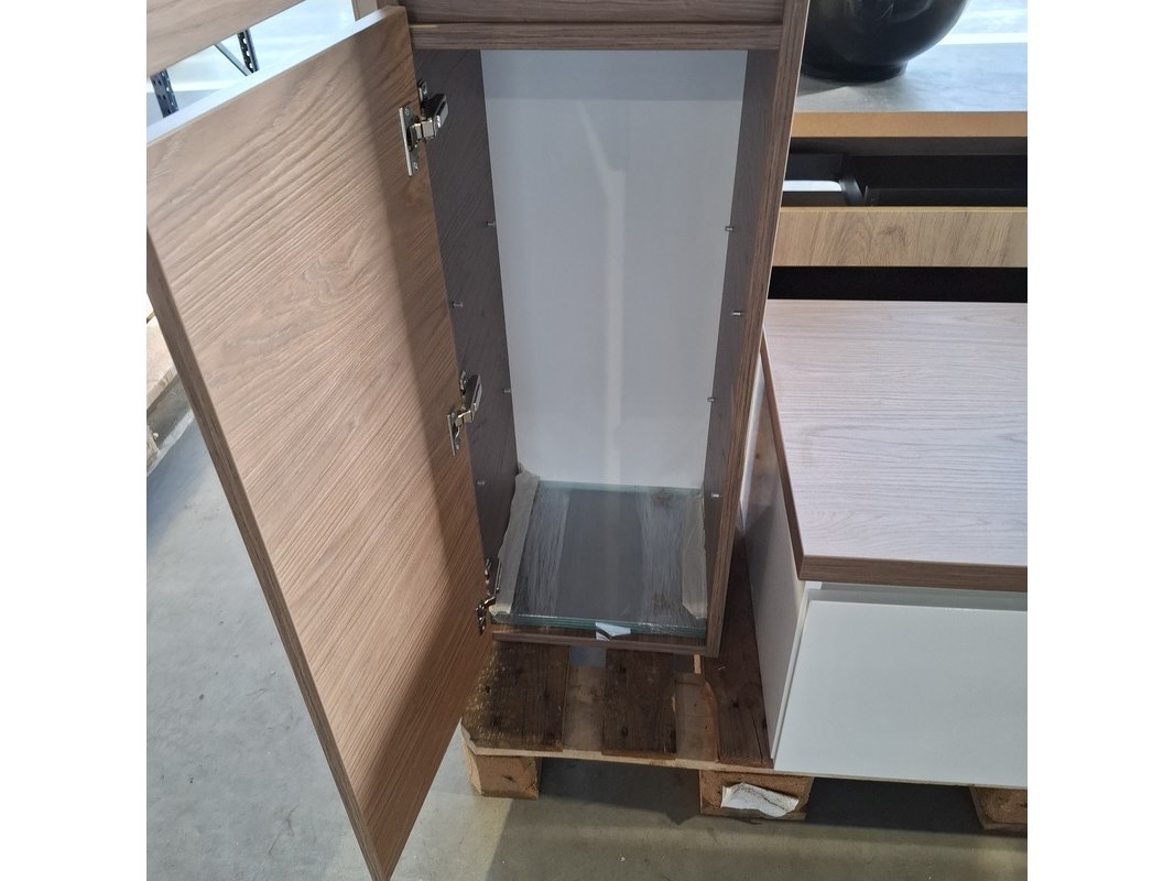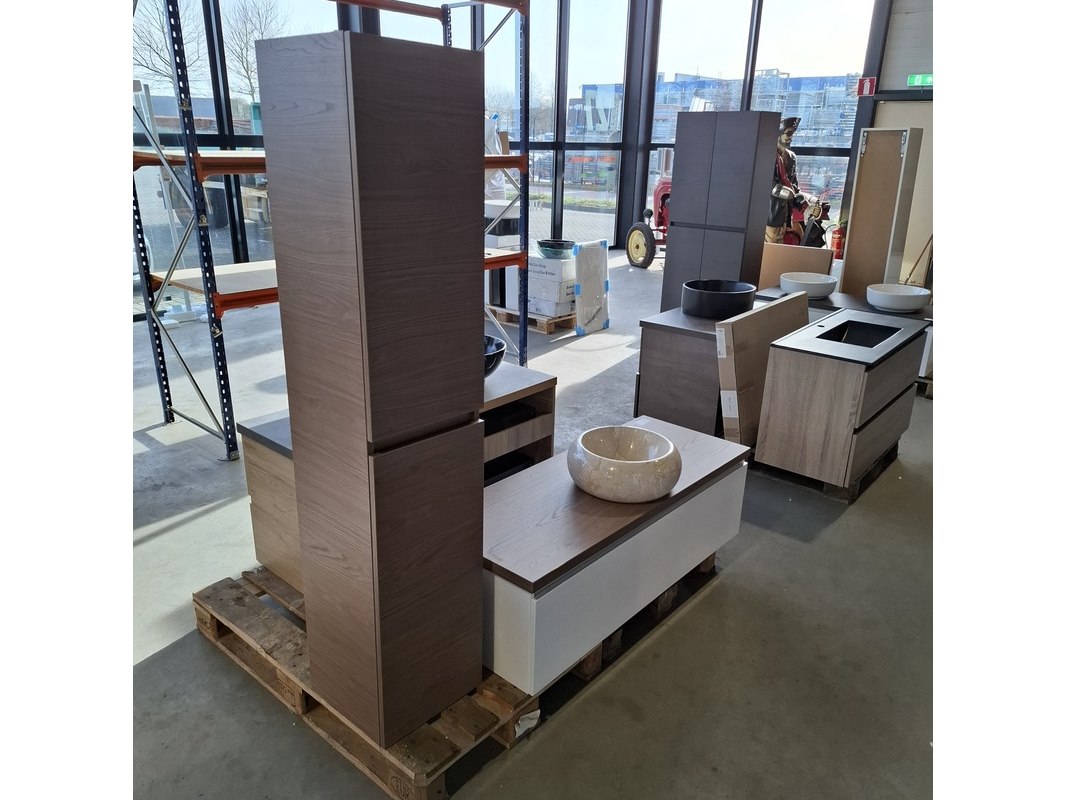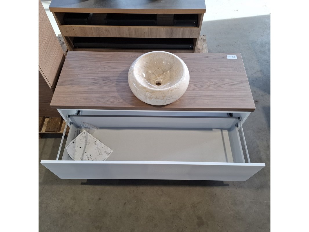 Merk: HR Badmeubelen Product: Badmeubel Kleur: Glans wit Afmeting: 130x50cm Specificaties: 1 lade met softclose, greeploos, topblad, honey, ronde marmeren waskom, 1 hoge kast, 160x35x35cm, 2 deurtjes met softclose, greeploos