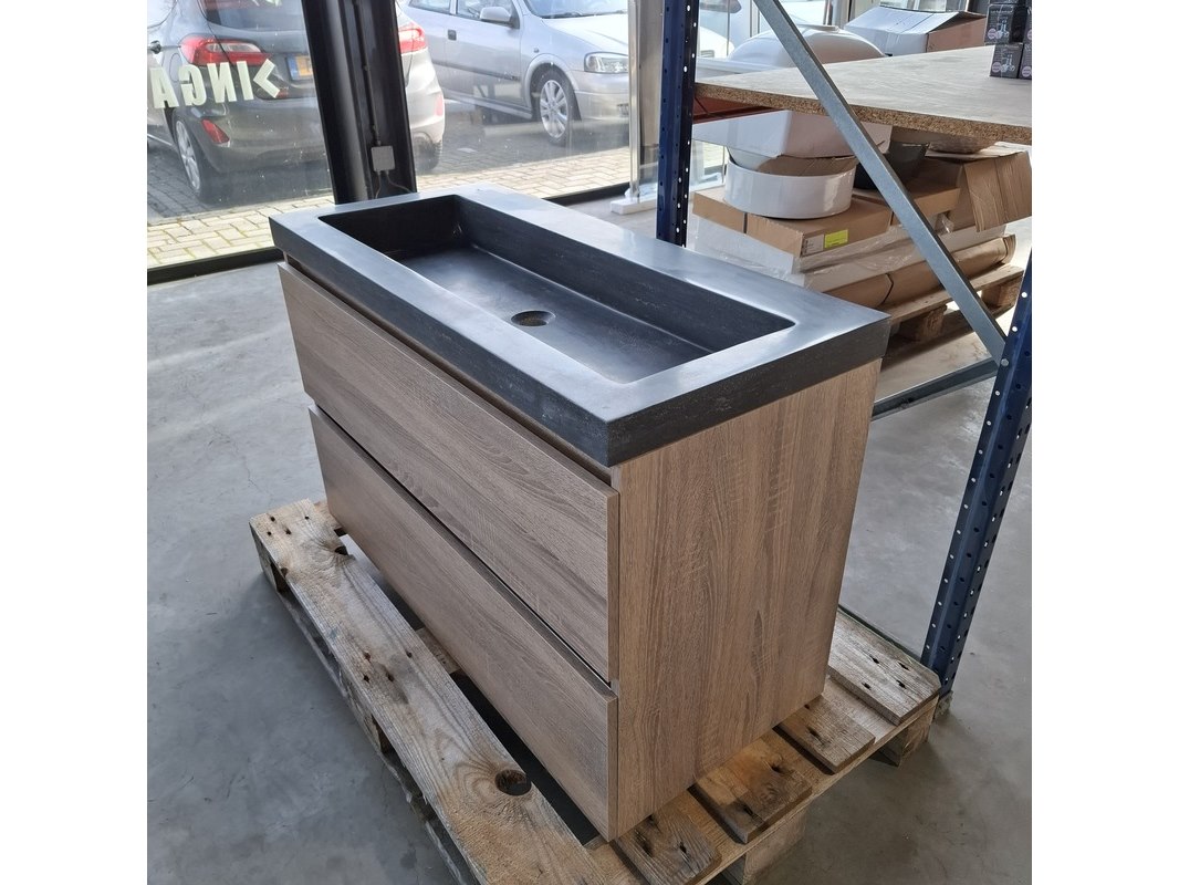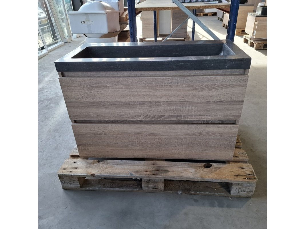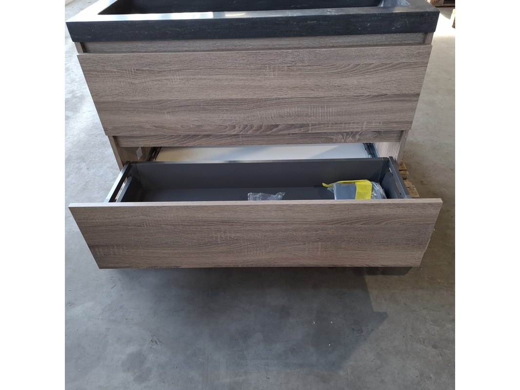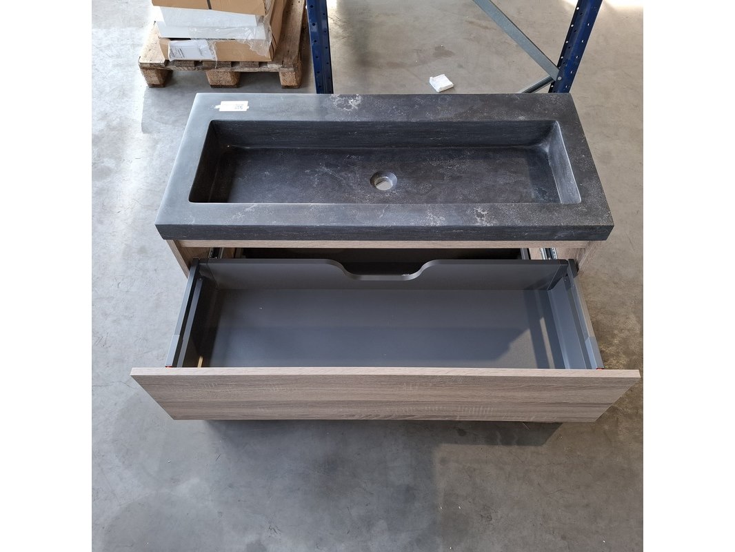 Merk: HR Badmeubelen Product: Badmeubel Kleur: Grijs eiken Afmeting: 100x46cm Specificaties: 2 lades met softclose, greeploos, hardstenen wastafel, antraciet