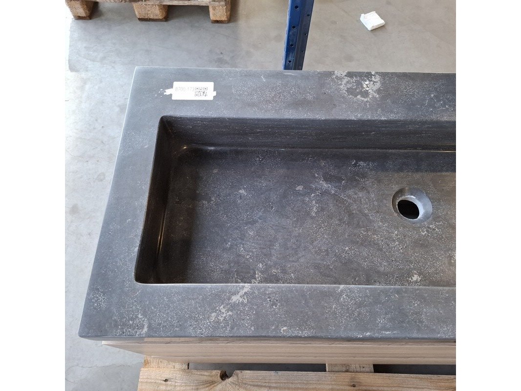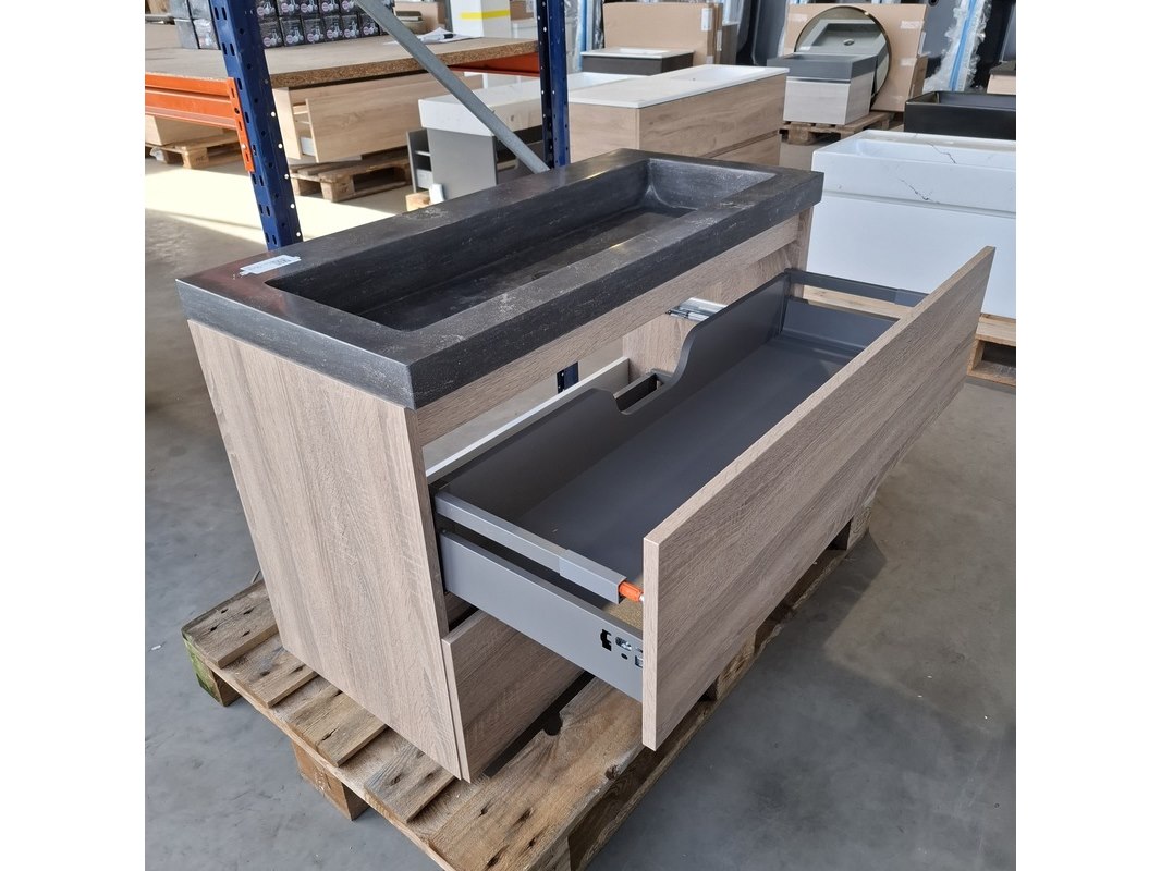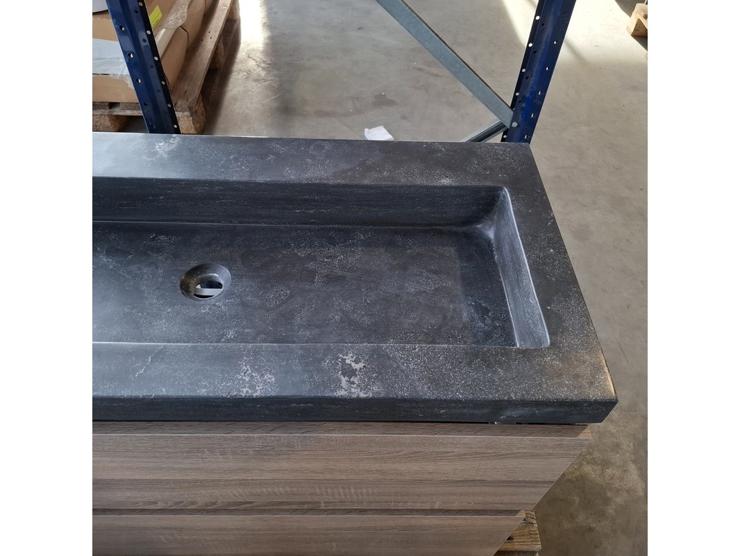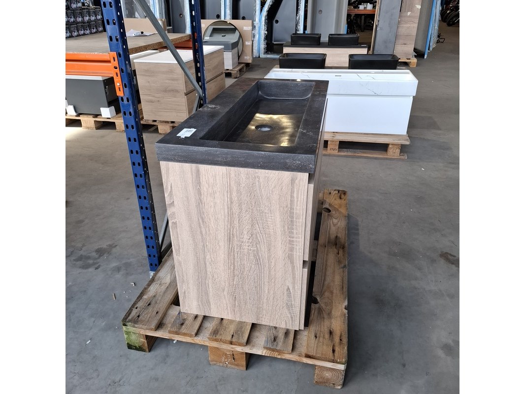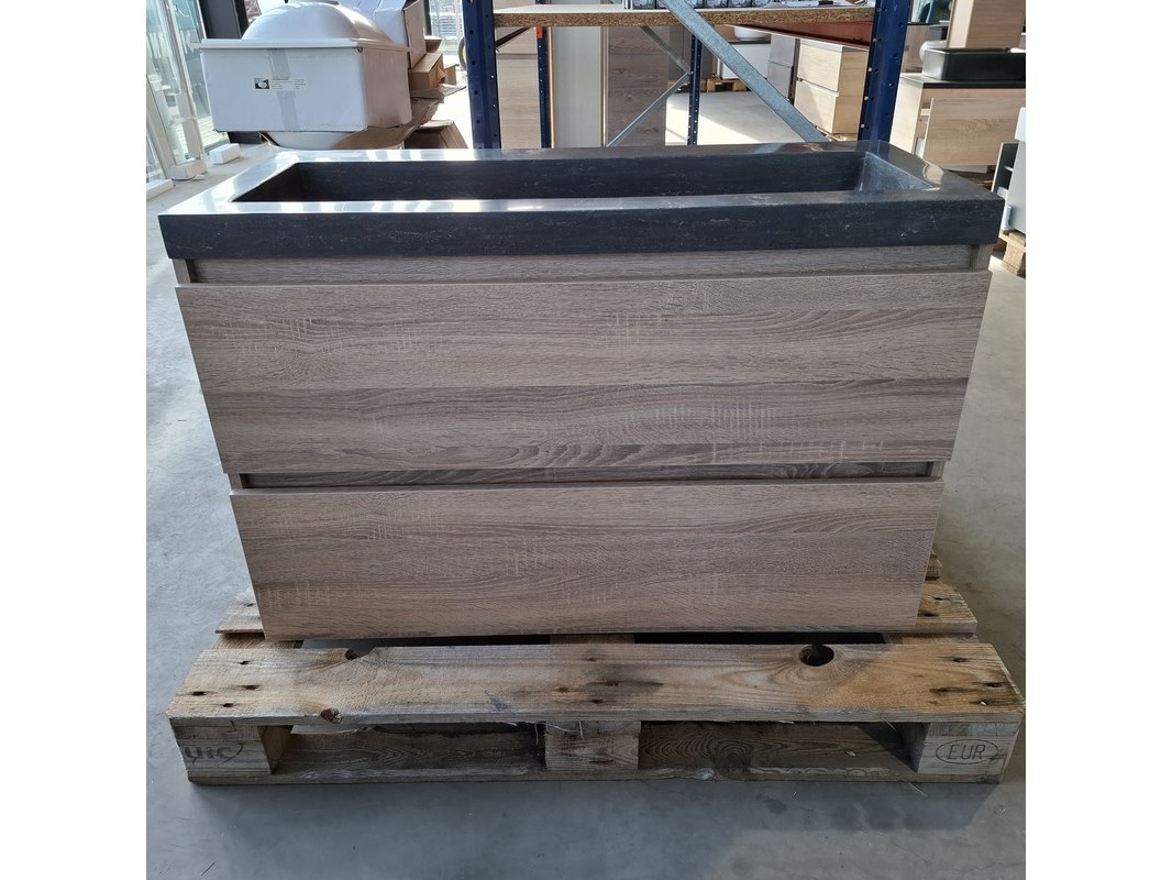 Merk: HR Badmeubelen Product: Badmeubel Kleur: Grijs eiken Afmeting: 100x46cm Specificaties: 2 lades met softclose, greeploos, hardstenen wastafel, antraciet