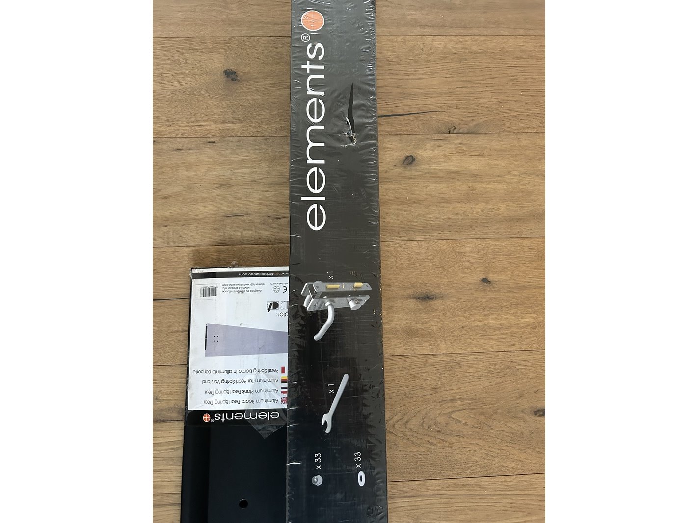 Merk: Elements Product: Tuindeur installatie set Kleur: Zwart Materiaal: Aluminium Afmeting: 180x90x3cm Conditie: Nieuw Specificaties: 1 x Royal park tuindeur installatie set