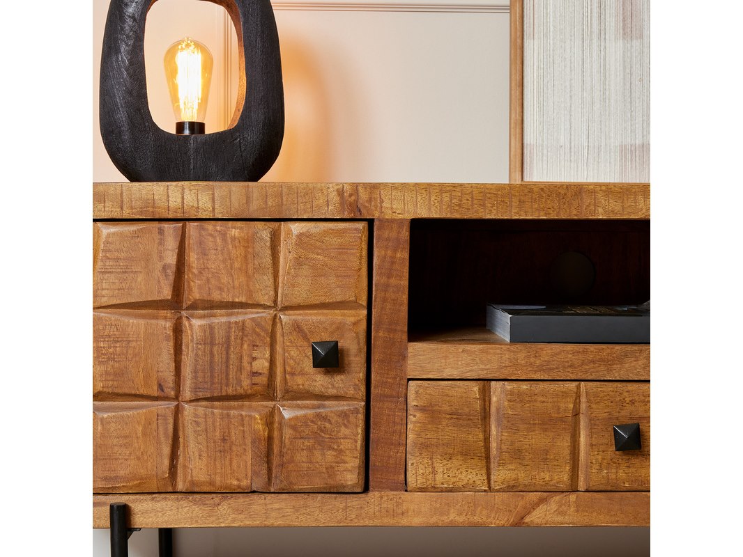 Merk: Starfurn Product: Tv Meubel Materiaal: Mango hout Afmeting: 150 cm BouwJaar: 2024 Conditie: Nieuw Specificaties: Tv meubel Brandy is uitgevoerd in mangohout met een metalen poot. Dit model is voorzien van één open vak, één lade en twee deuren. Het tv meubel is ingelegd met verschillende stroken gelakt hout. Het ingesneden blokken patroon geeft de woonserie Brandy van Starfurn een unieke uitstraling. Afmetingen Breedte: 150 cm Diepte: 40 cm Hoogte: 55 cm Poothoogte: 16 cm Afmetingen binnen vak Breedte: 50 cm Diepte: 37.5 cm Hoogte: 14.5 cm