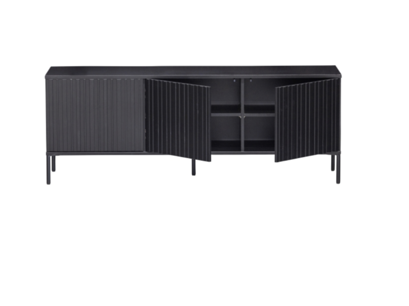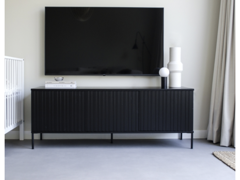 Merk: New Gravure Product: TV-Meubel Kleur: Zwart Materiaal: Grenen Afmeting: 150cm Conditie: Nieuw Specificaties: De uitermate populaire Gravure serie in een nieuw jasje, dat is de New Gravure. Een hip en modulair tv-meubel met grafische reliëf deuren, in grenenhout en afgewerkt met een diepzwarte beits en met zwarte, metalen poten. Dit betreft een retour gestuurd artikel. breedte: 150 cm.