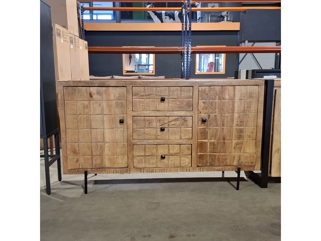Merk: Starfurn Product: Dressoir Materiaal: Mango hout Afmeting: 160 x 40 x 90 BouwJaar: 2024 Conditie: Nieuw Specificaties: Beschrijving Dressoir Brandy is uitgevoerd in mangohout met een metalen poot. Dit model is voorzien van twee deuren en 3 lades. De kast is ingelegd met verschillende stroken gelakt hout. Het ingesneden blokken patroon geeft de woonserie Brandy van Starfurn een unieke uitstraling. Afmetingen Breedte: 160 cm Diepte: 40 cm Hoogte: 90 cm Poothoogte: 16 cm
