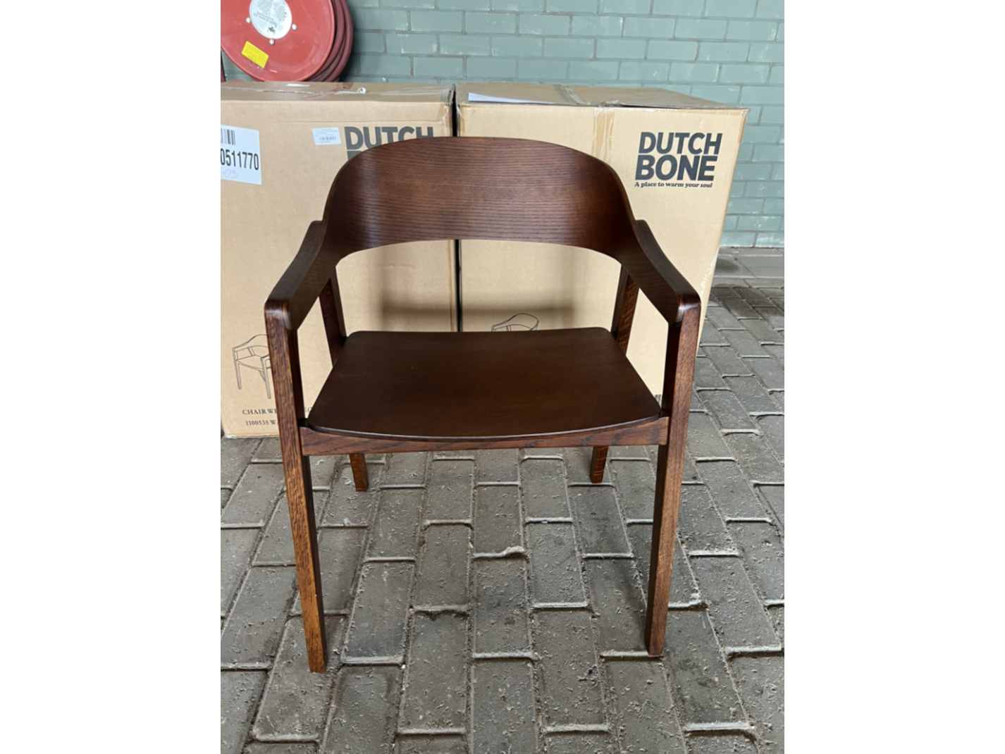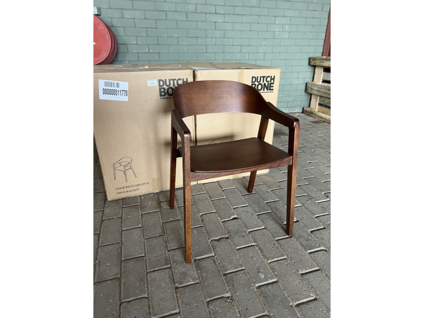 Merk: Dutchbone Product: Eetkamerstoel Kleur: Walnoot Materiaal: Hout Conditie: Nieuw Specificaties: Set van 4, 2 per doos. De stijlvolle Dutchbone Westlake stoelen toveren de eetkamer moeiteloos om in een knusse plek – a place to warm your soul. Deze stoelen zijn namelijk tot stand gekomen door puur vakmanschap. De rugleuning van gebogen hout sluit naadloos aan op de binnenzijde van de armleuningen, die op hun beurt weer overlopen in de poten. In het midden van het frame rust de licht gebogen zitting. Deze is samen met de rugleuning zo gevormd, dat de stoel goed is voor urenlang zitplezier. Perfect om tot in de late uurtjes na te tafelen met geliefden dus! Met deze stoelen creëer je een sfeervolle eetkamer, waarin je heerlijk thuiskomt. Gecontroleerde retouren.