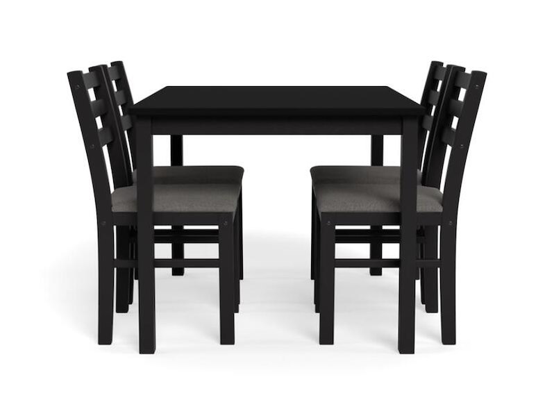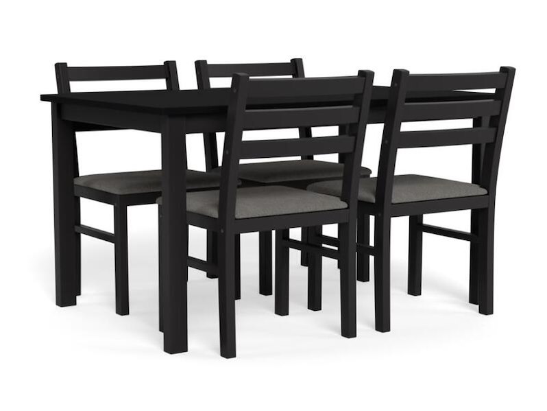 Product: Tafel met 4 stoelen Kleur: Zwart Materiaal: Hout Afmeting: 110x70x74,5 cm BouwJaar: 2024 Conditie: Nieuw Specificaties: Deze eethoek, gekenmerkt door een eenvoudige, hoekige vorm, is ontworpen om bij diverse interieurstijlen te passen. De set bestaat uit een rechthoekige eettafel en 4 bijpassende stoelen met gewatteerde lichtgrijze zittingen, allemaal gemaakt van stevig hout met een matzwarte afwerking. Ideaal voor dagelijks gebruik en past zowel in moderne als traditionele eetkamers. Belangrijkste kenmerken Eetkamerset voor 4 personen Klassieke stijl die perfect past bij moderne en traditionele ruimtes. Eenvoudige en hoekige vormen Gemaakt van stevig hout met een matzwarte, gelakte afwerking. Eetkamerstoelen met open rugleuning en gewatteerde lichtgrijze zitting. Rechthoekige tafel