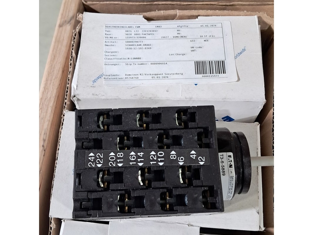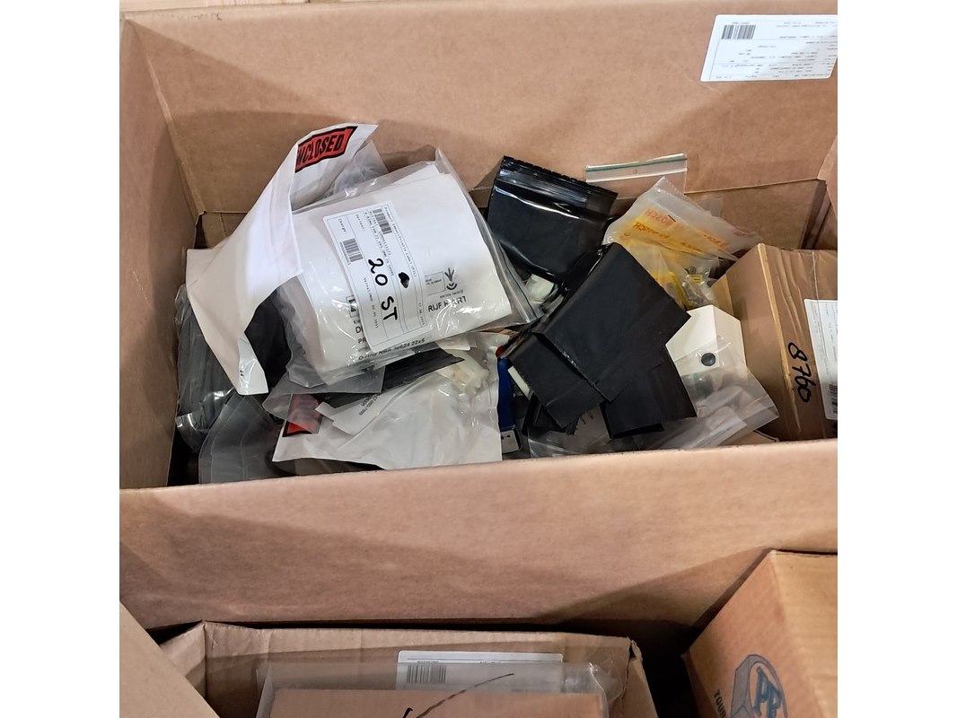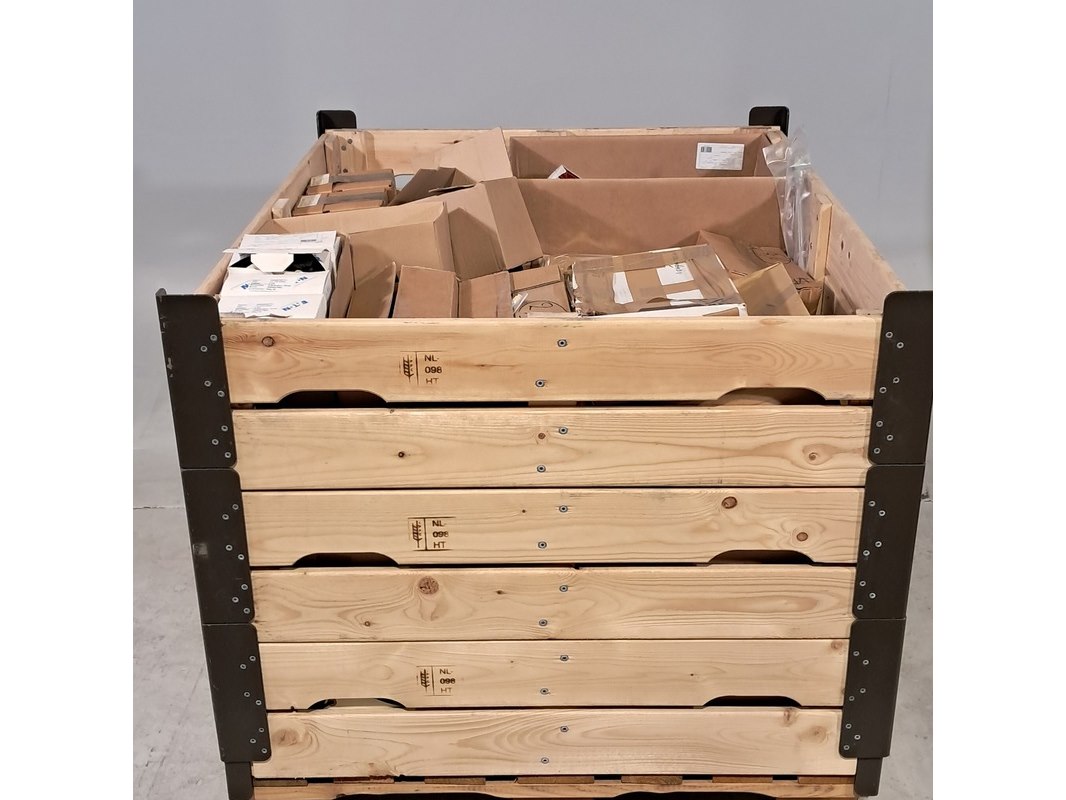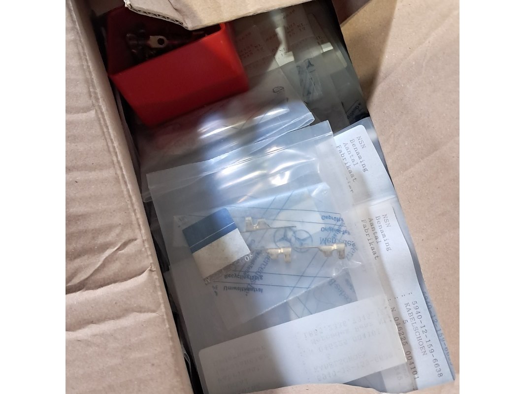 Product: Diverse onderdelen en elektra Specificaties: Bestaande uit o.a. schroeven, schakelaars, lampen, kabelschoenen, rubberen ringen, lagers, slagpluggen, etc Technische staat en compleetheid onbekend. Exclusief palletkist.