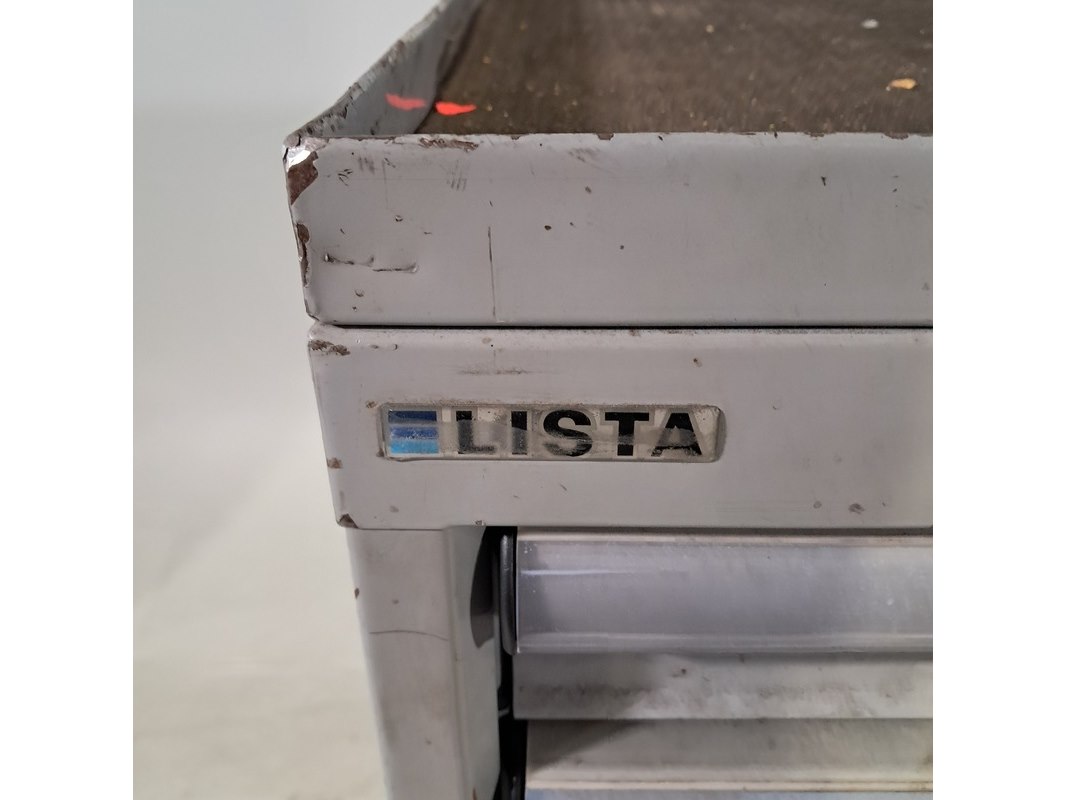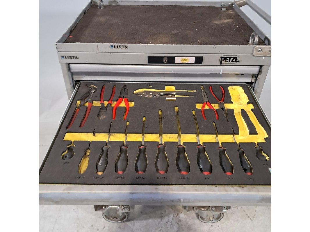 Merk: Lista Product: Gereedschapswagen met inhoud Afmeting: hxbxd ca. 118x79x58 cm Specificaties: Inhoud bestaande uit o.a. diverse tangen, schroevendraaiers, dop sleutel set, steek ring sleutels, vijlen, inbus sleutels, etc Technische staat en compleetheid onbekend.