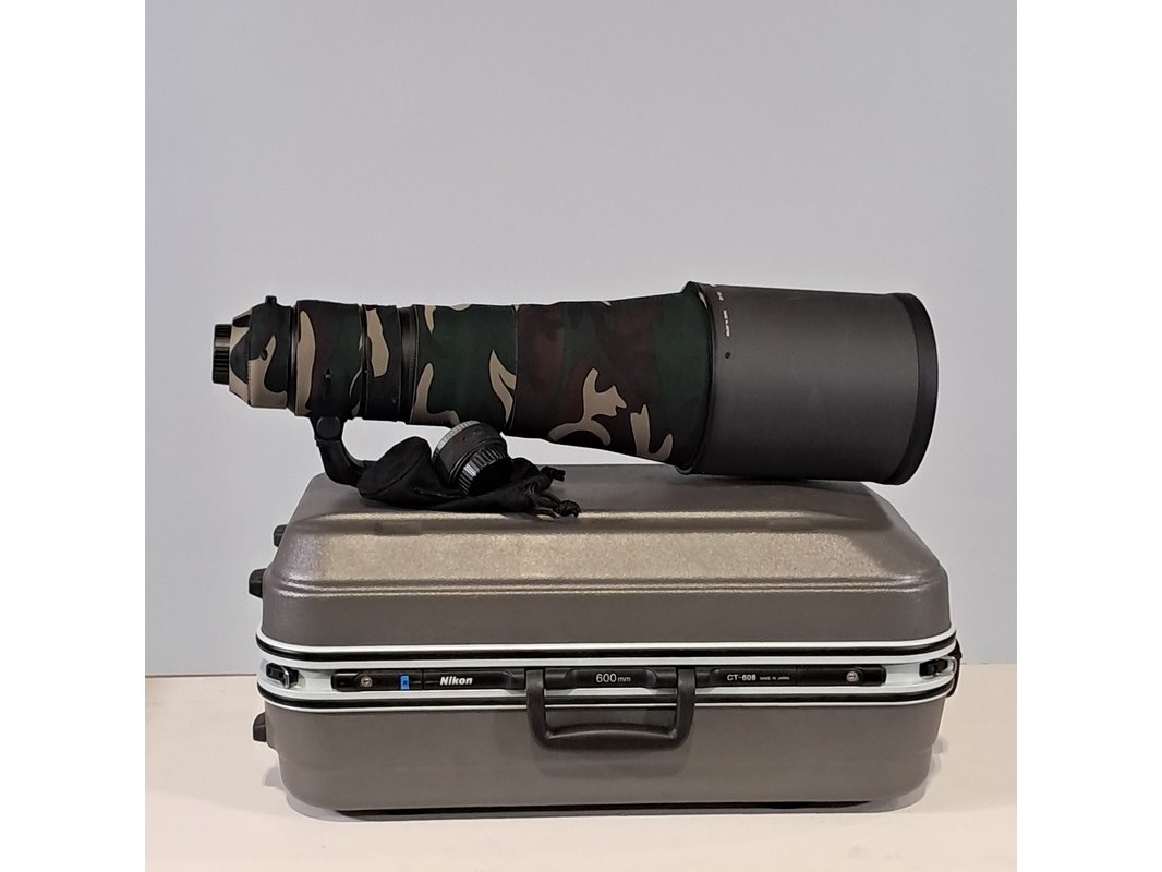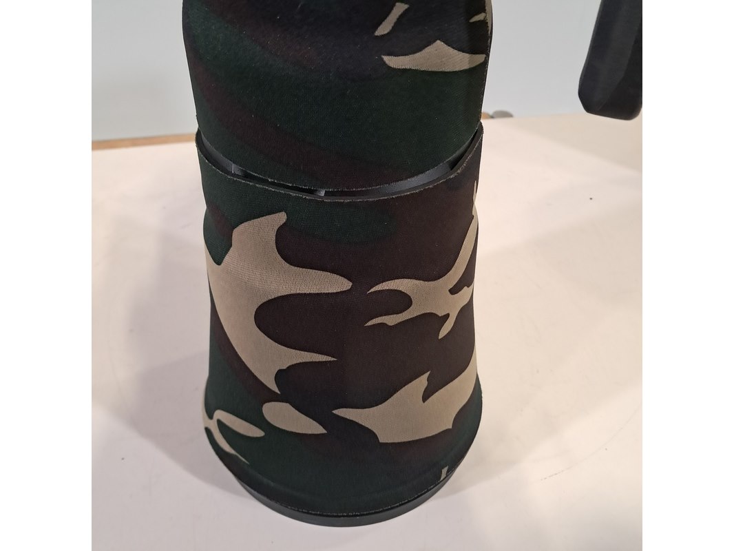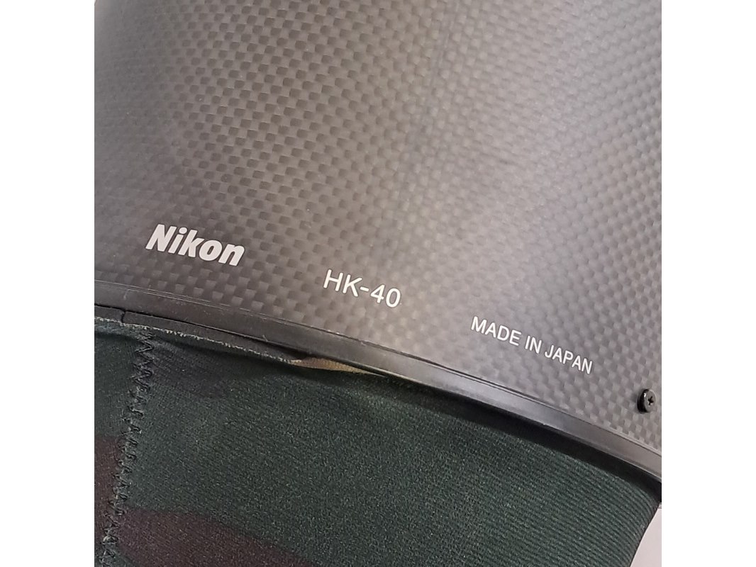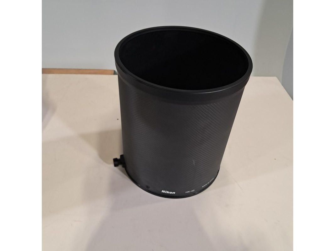 Merk: Nikon Product: Cameralens Afmeting: Lengte ca. 45 cm Specificaties: Uitgerust met zonnekap Nikon HK40 Bevestigingspunt camera gebroken.