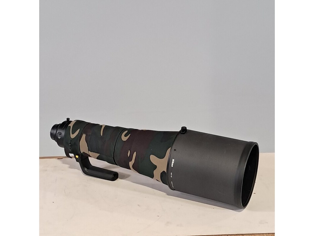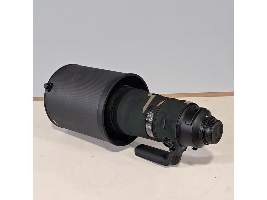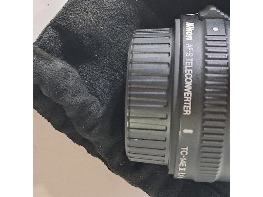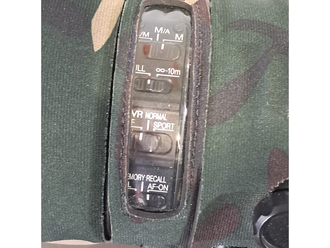 Merk: Nikon Product: Cameralens Afmeting: Lengte ca. 45 cm Specificaties: Uitgerust met zonnekap Nikon HK40 Bevestigingspunt camera gebroken.