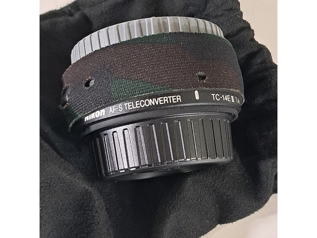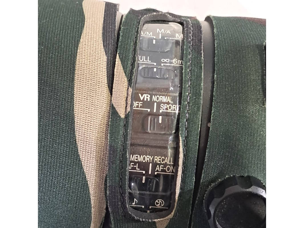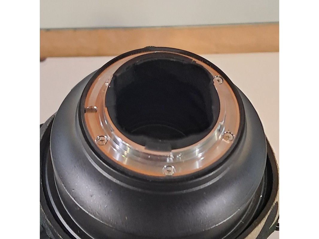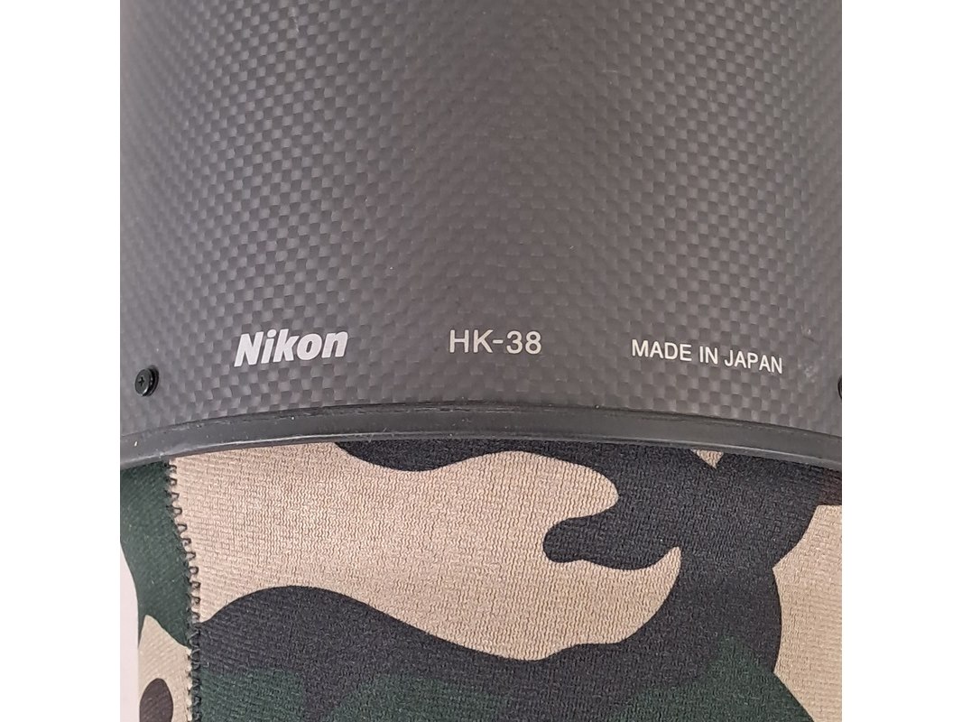Merk: Nikon Product: Cameralens Afmeting: Lengte ca. 45 cm Specificaties: Uitgerust met zonnekap Nikon HK40 Bevestigingspunt camera gebroken.