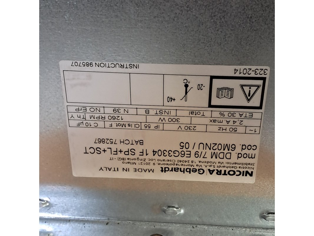 Merk: Nicotra Gbhardt Product: Centrifugaal ventilator Afmeting: lxb ca. 35x37 cm Specificaties: 230V 50Hz 2.4A Technische staat en compleetheid onbekend. Exclusief pallet
