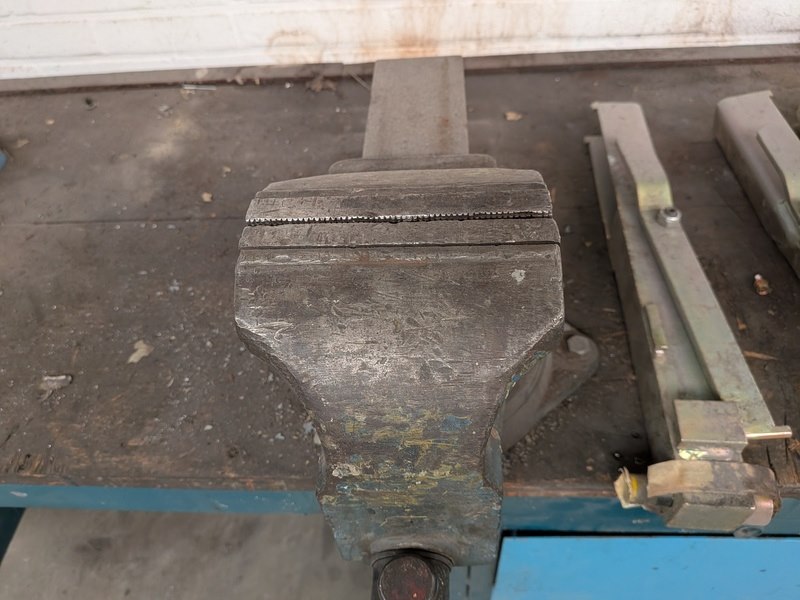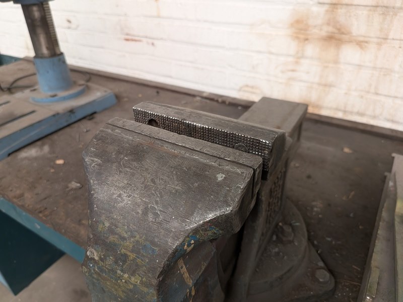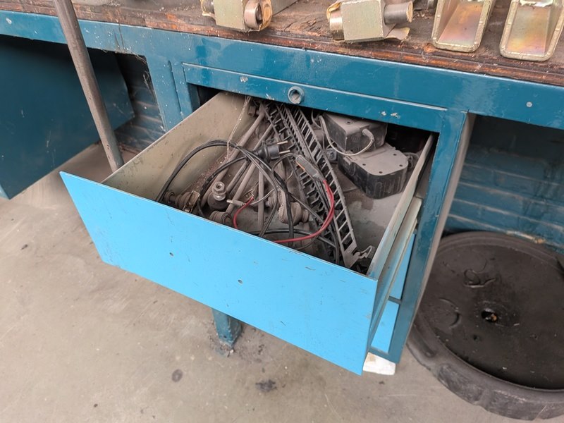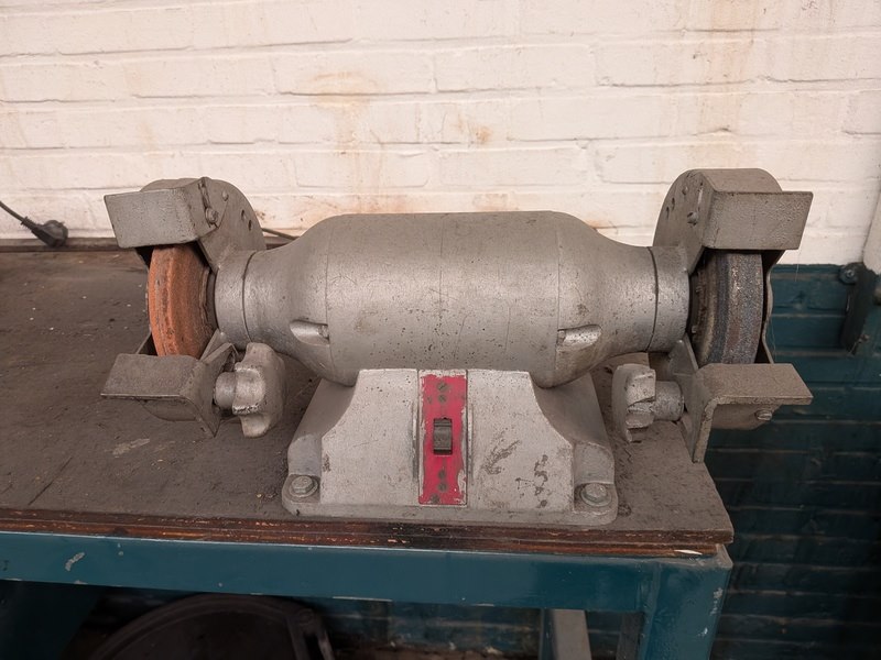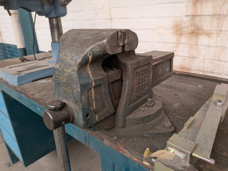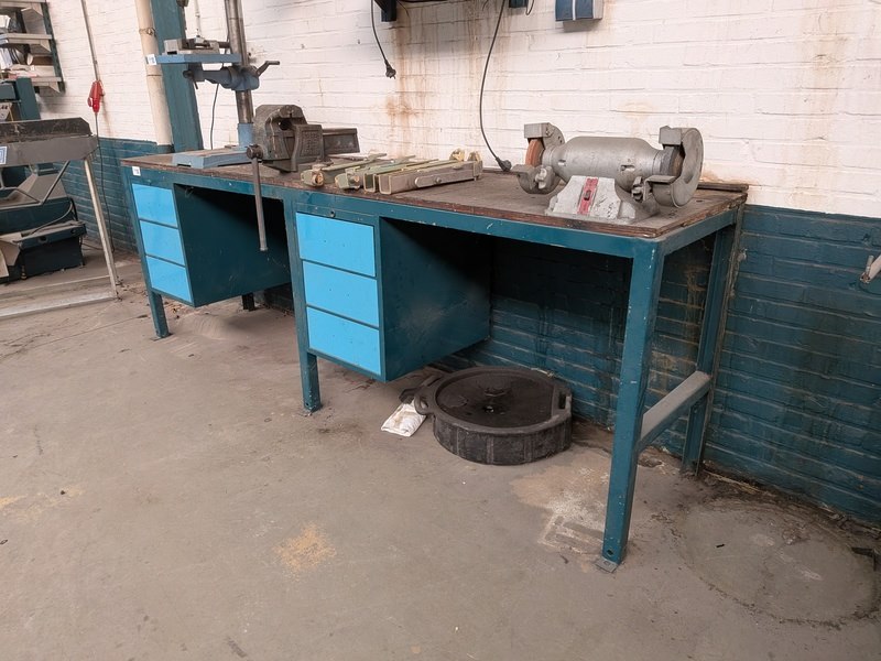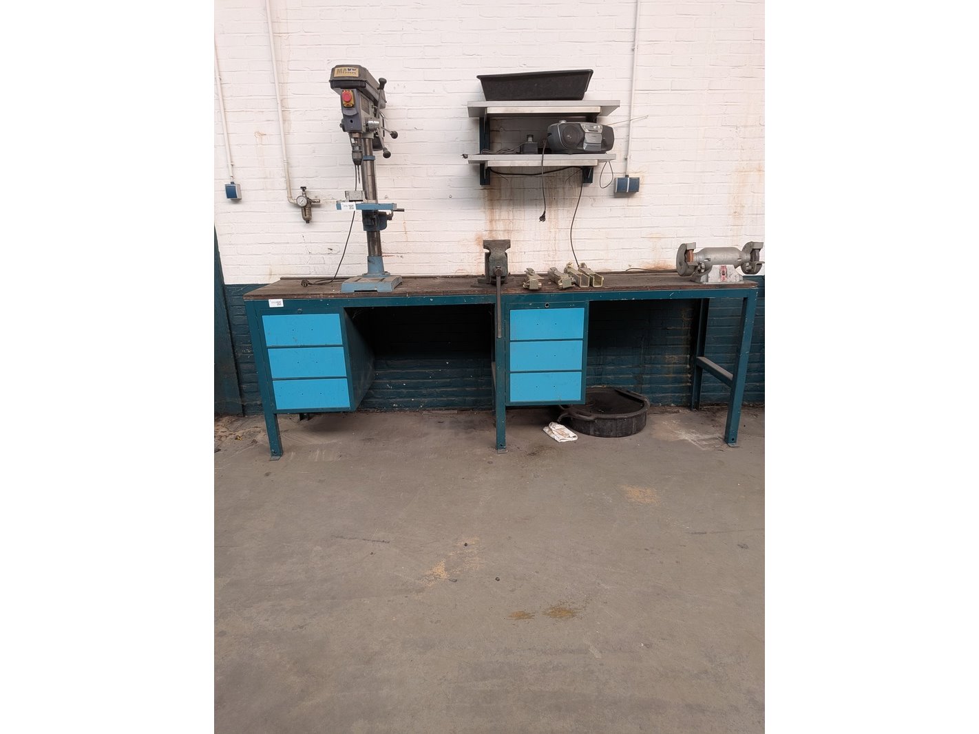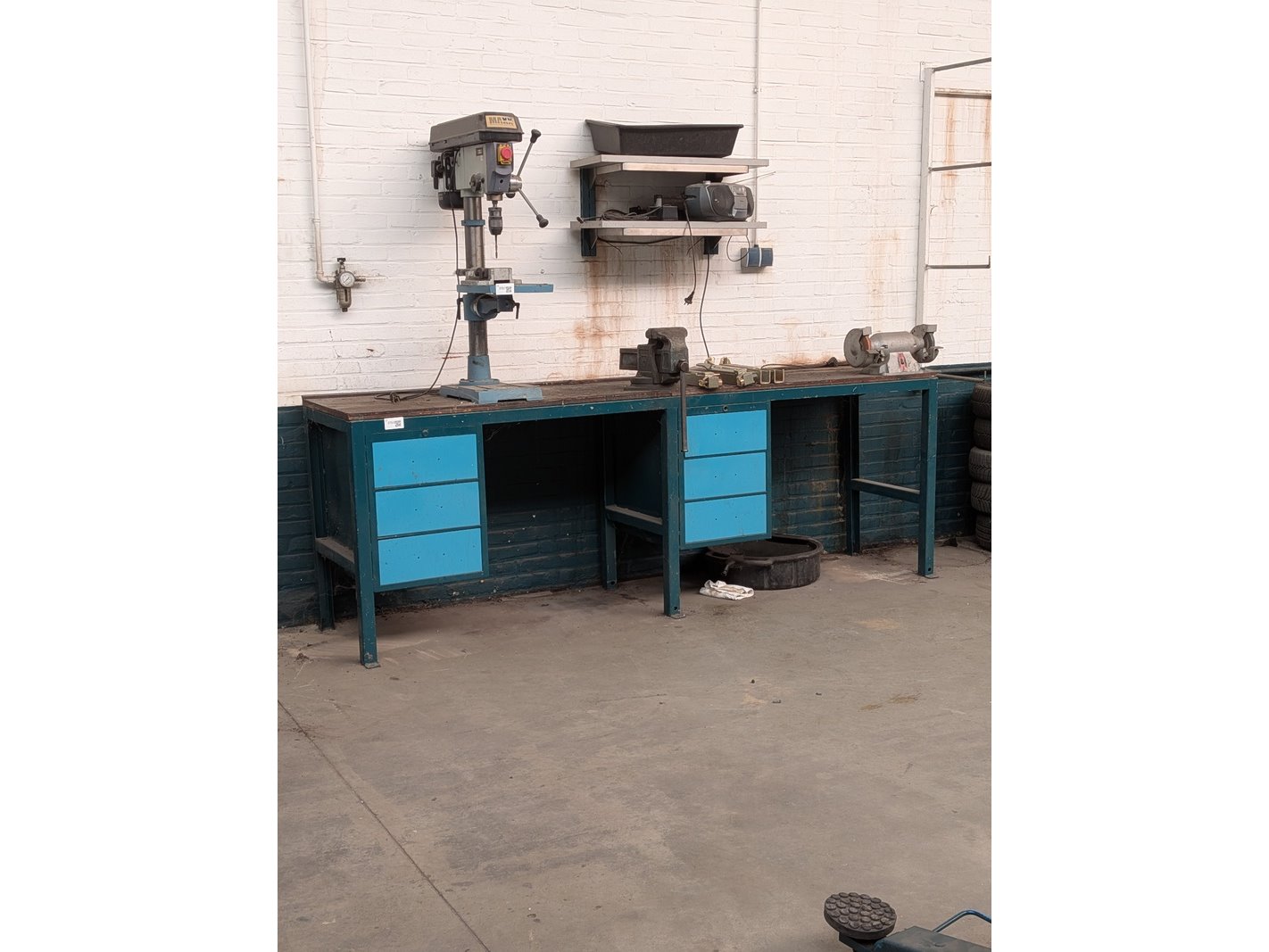 Product: Werkbank v.v. bankschroef en slijper Materiaal: metalen frame, houten blad Afmeting: lxbxh ca. 271x63x94cm