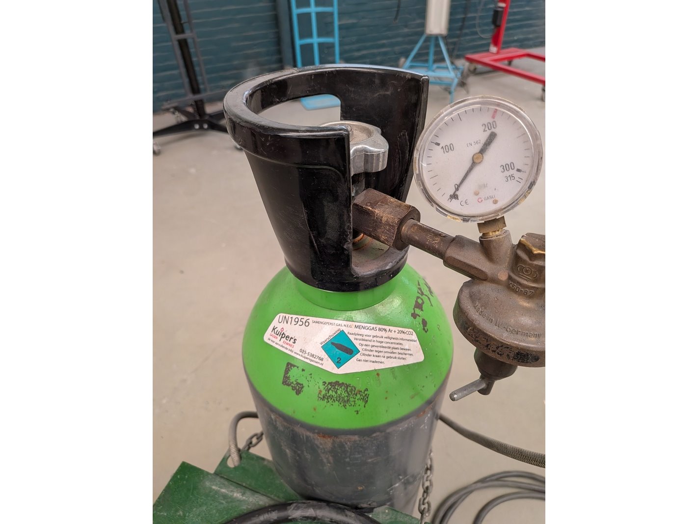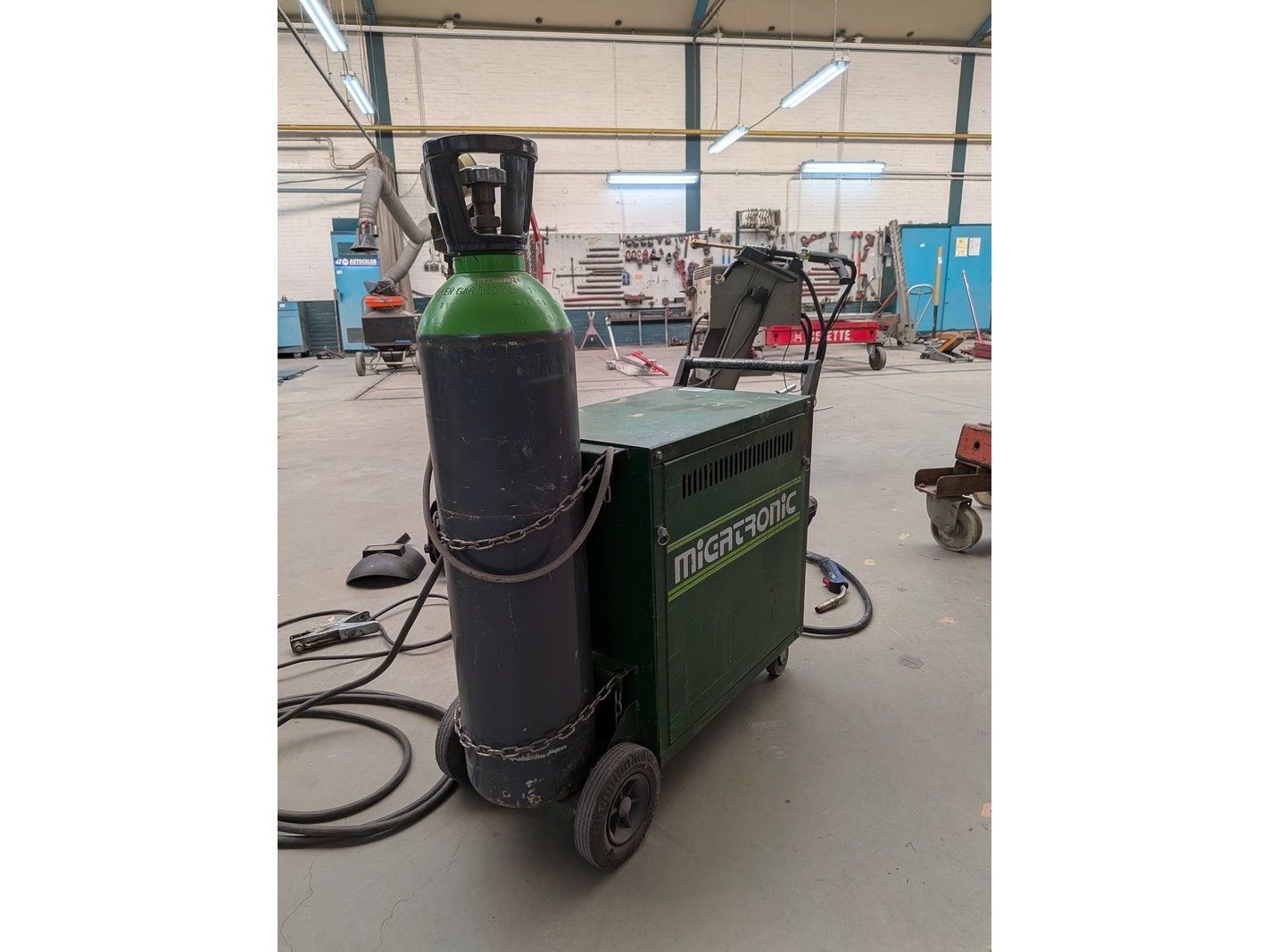 Merk: Migatronic Product: Lasapparaat Specificaties: 380V, met massaklem, lastoorts, drukventiel en cilinder menggas, deels gevuld