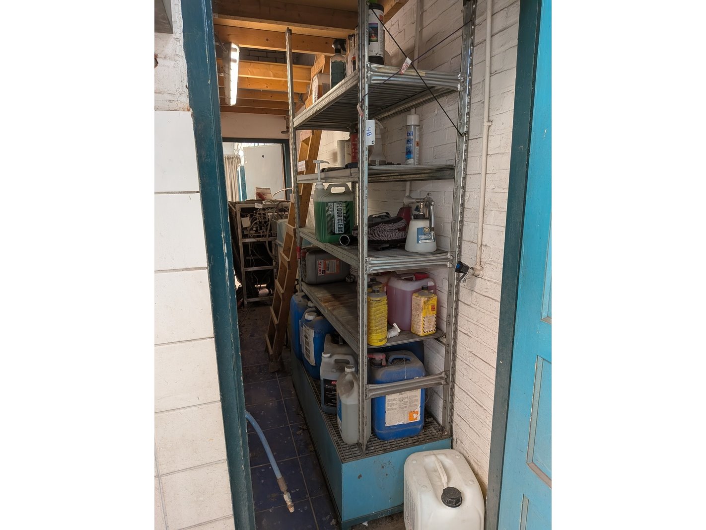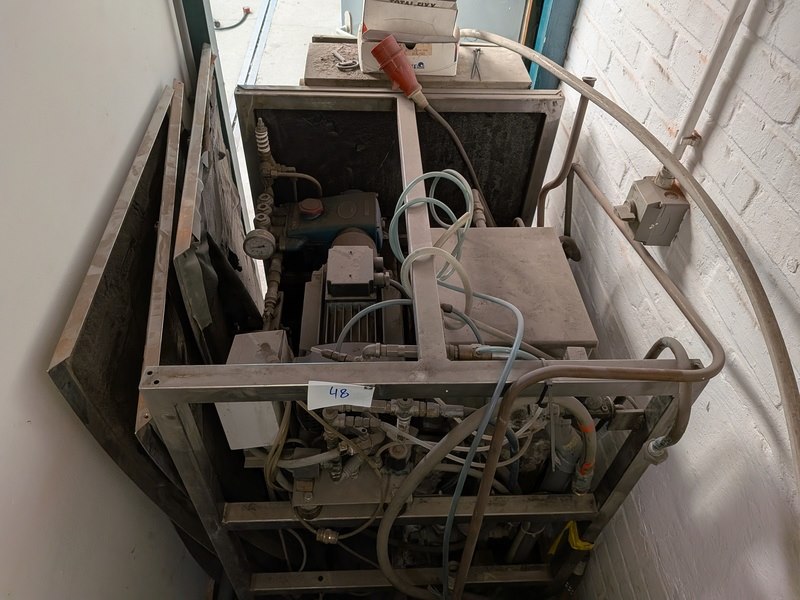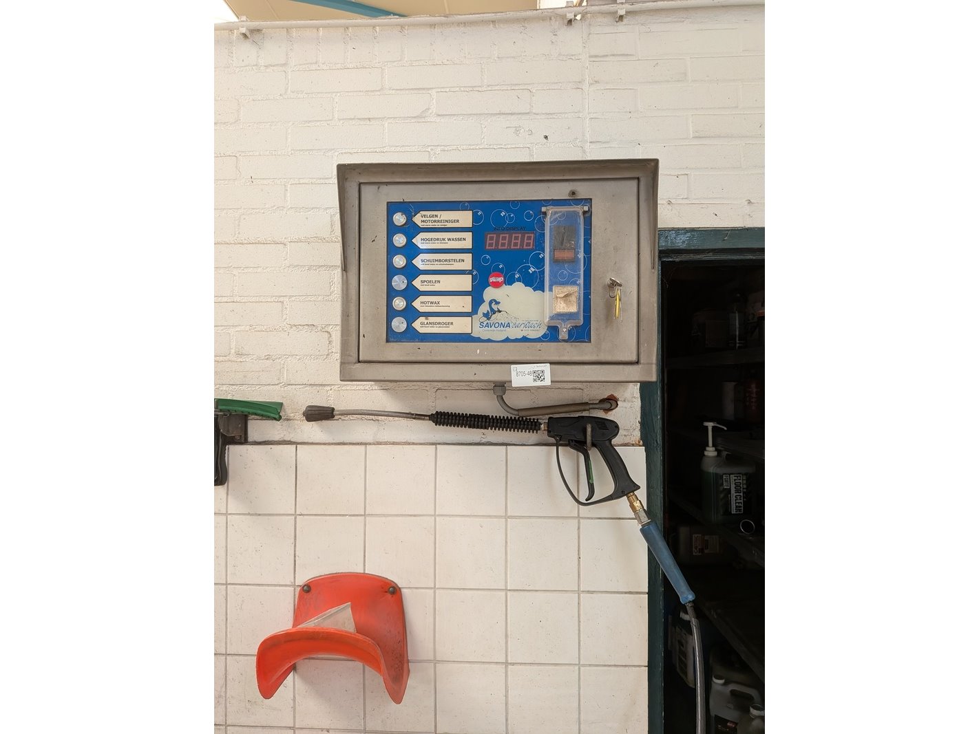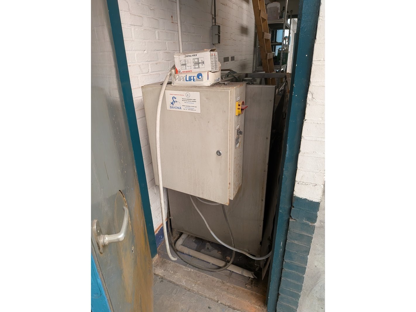 Merk: Savona Product: Hogedrukreiniger set Specificaties: 380V, werking onbekend inclusief stelling met diverse schoonmaakprodukten en spuitlans met zwenkarm (hangt op ca. 350cm hoogte), bediening unit