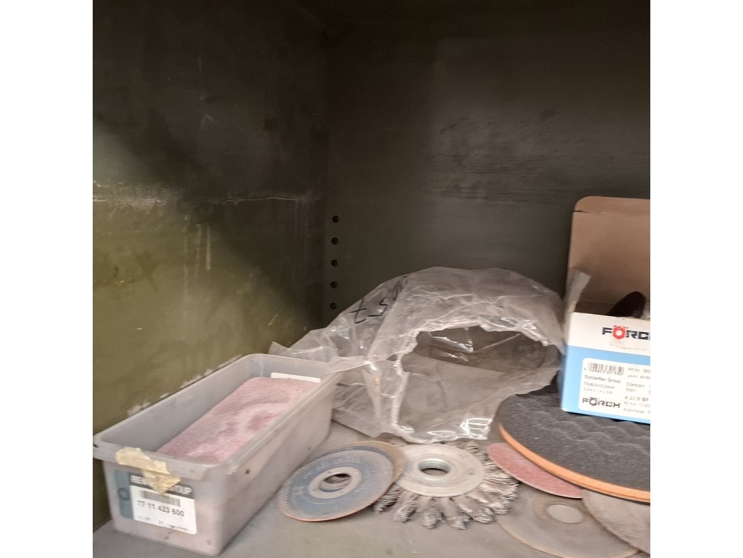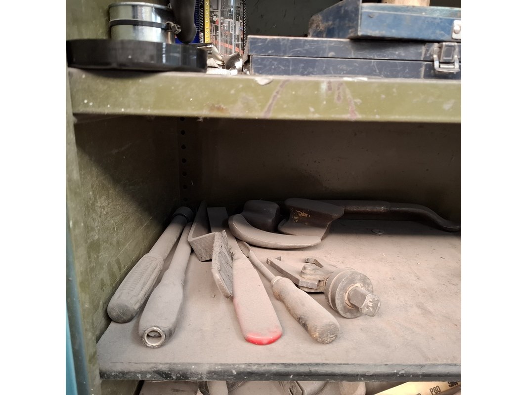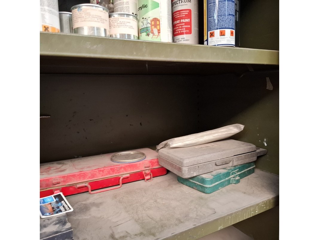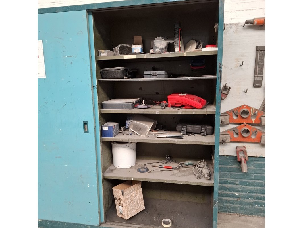 Product: Schuifdeurkast met inhoud Materiaal: metaal Afmeting: hxbxd ca. 195x201x51cm