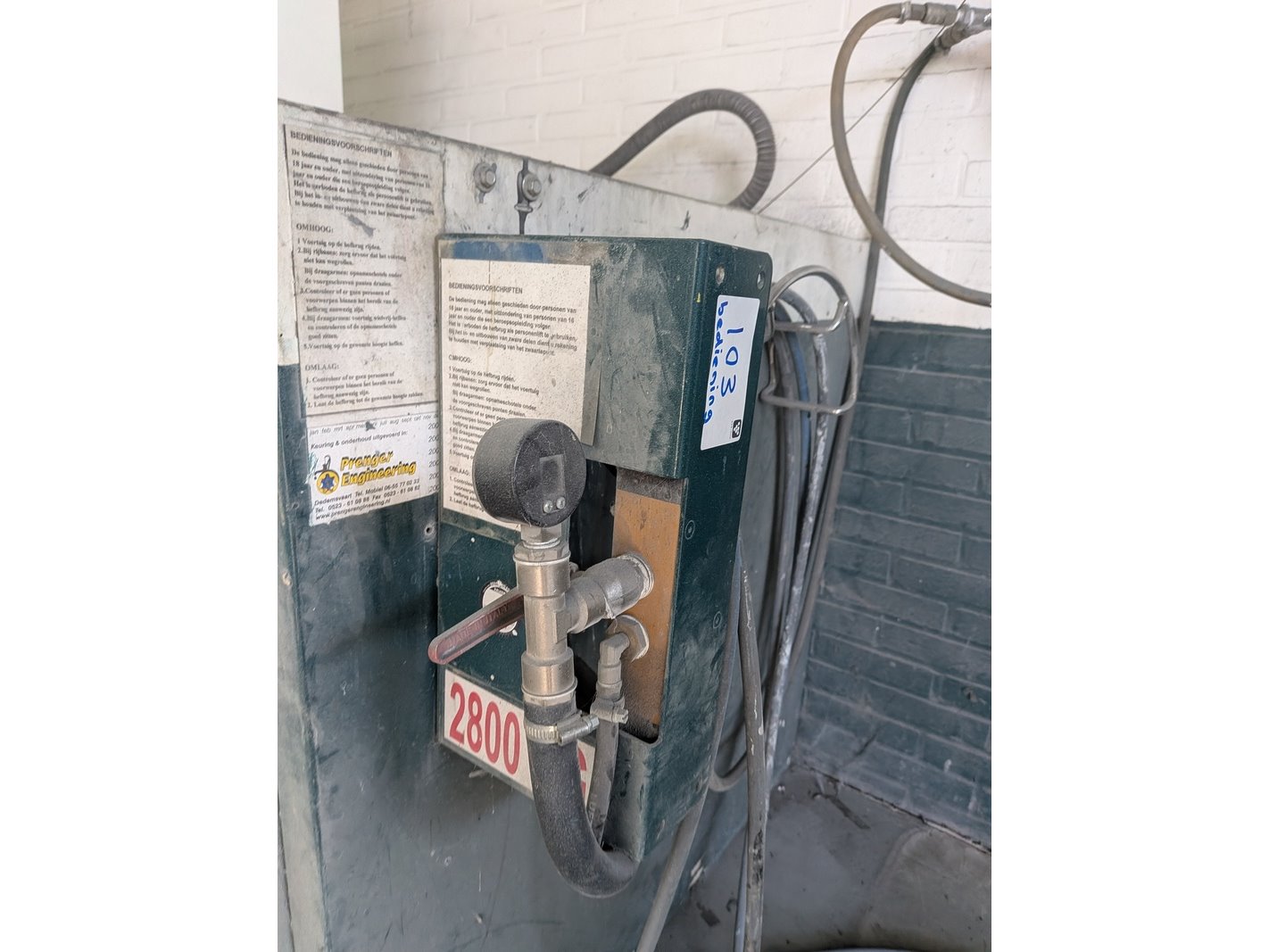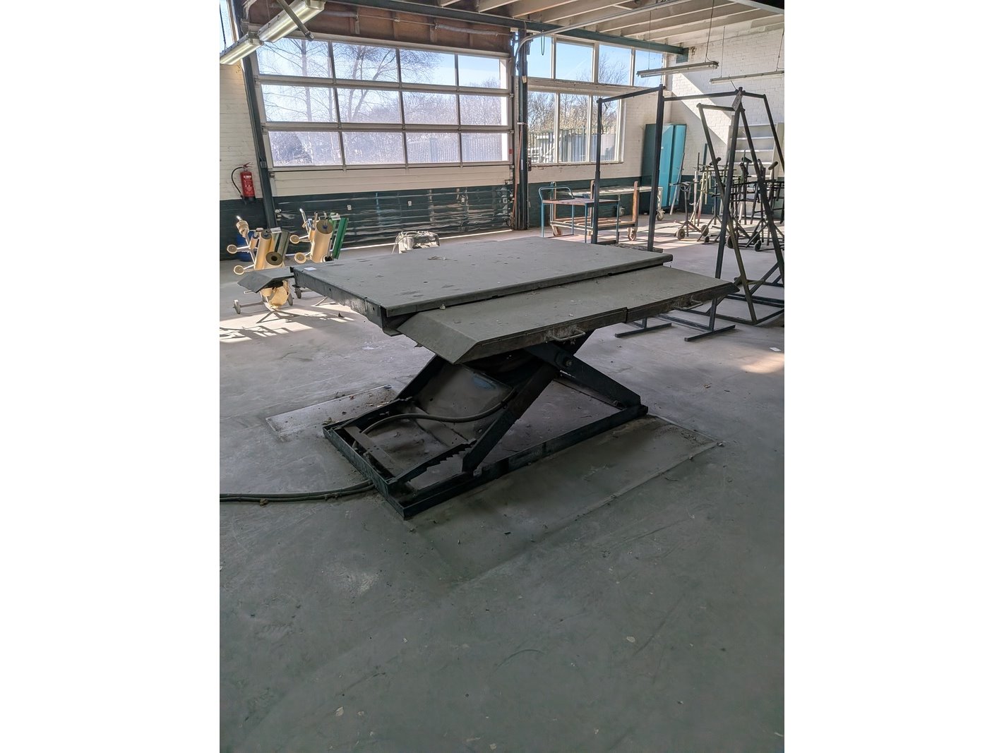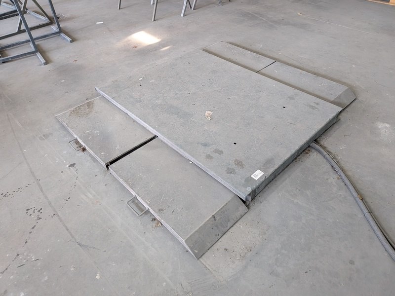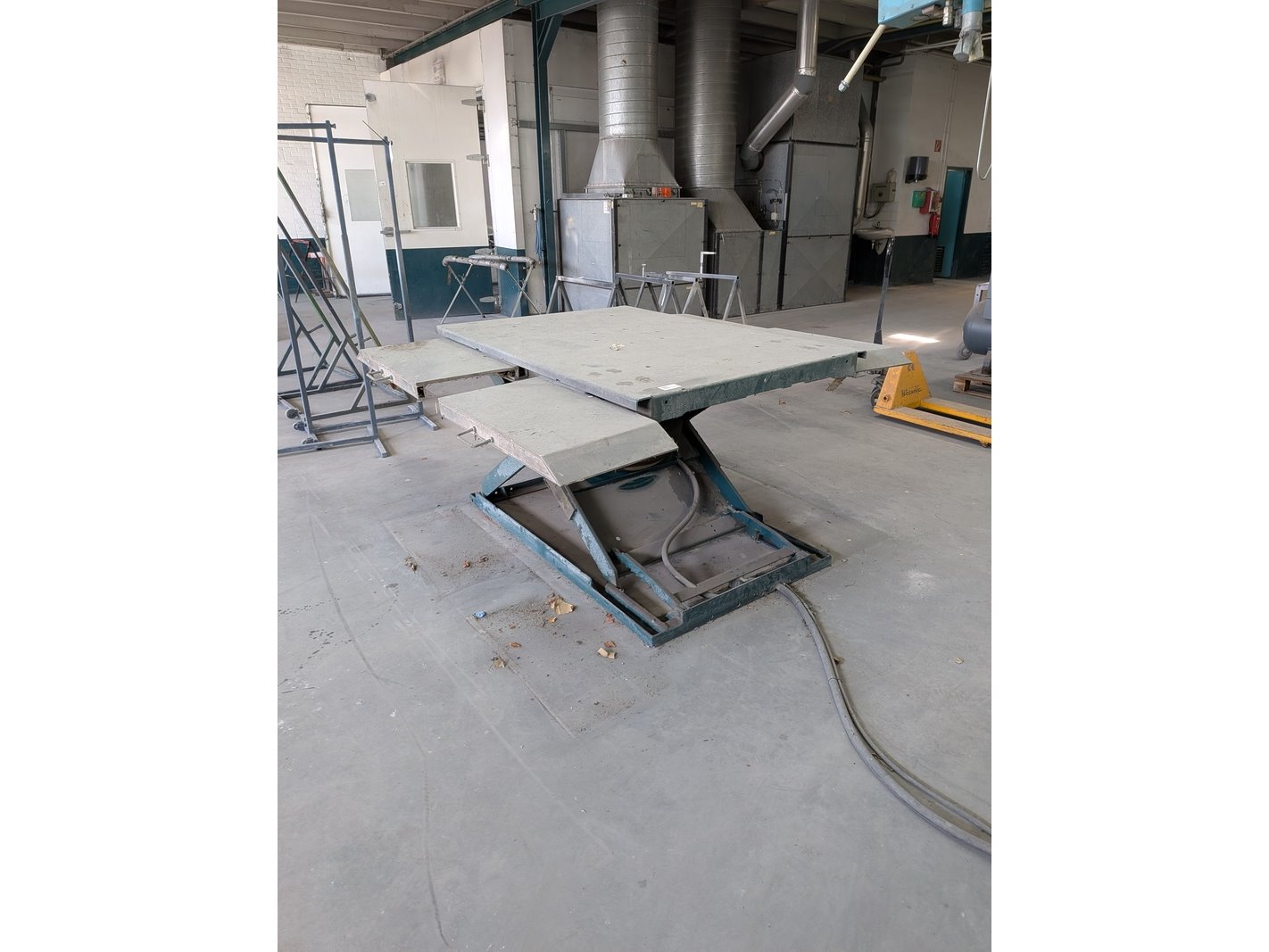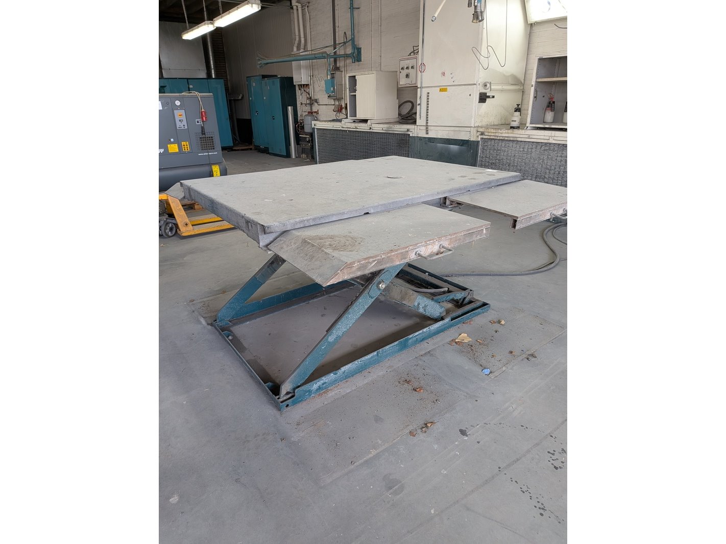 Product: Pneumatische heftafel, max 2800 kilo Afmeting: lxbxh ca. 162x186x12/7cm Specificaties: max hefhoogte ca. 86,5cm Is aan de vloer gebout Let op! Bedieningspaneel aan filterkast gemonteerd, luchtleiding loopt deels door filterkast