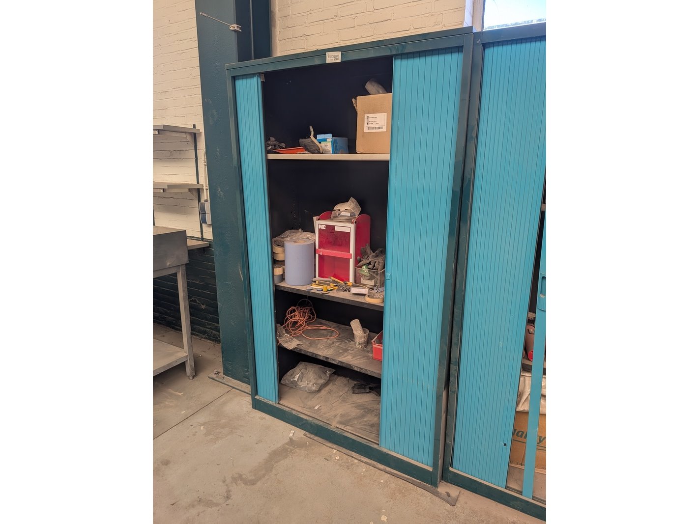 Product: Lameldeurkast met inhoud Afmeting: hxbxd ca. 195 x 120 x 45 cm Conditie: gebruikt Specificaties: excl. Sleutels
