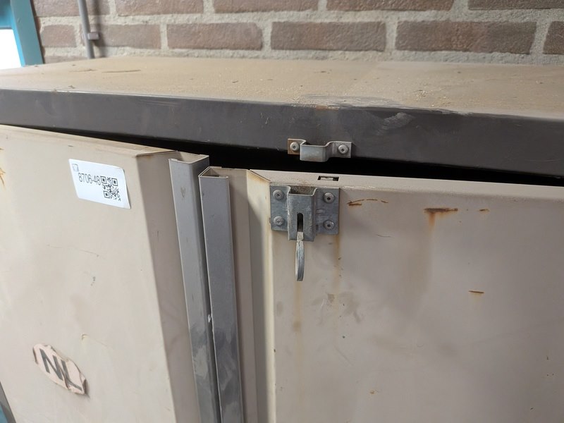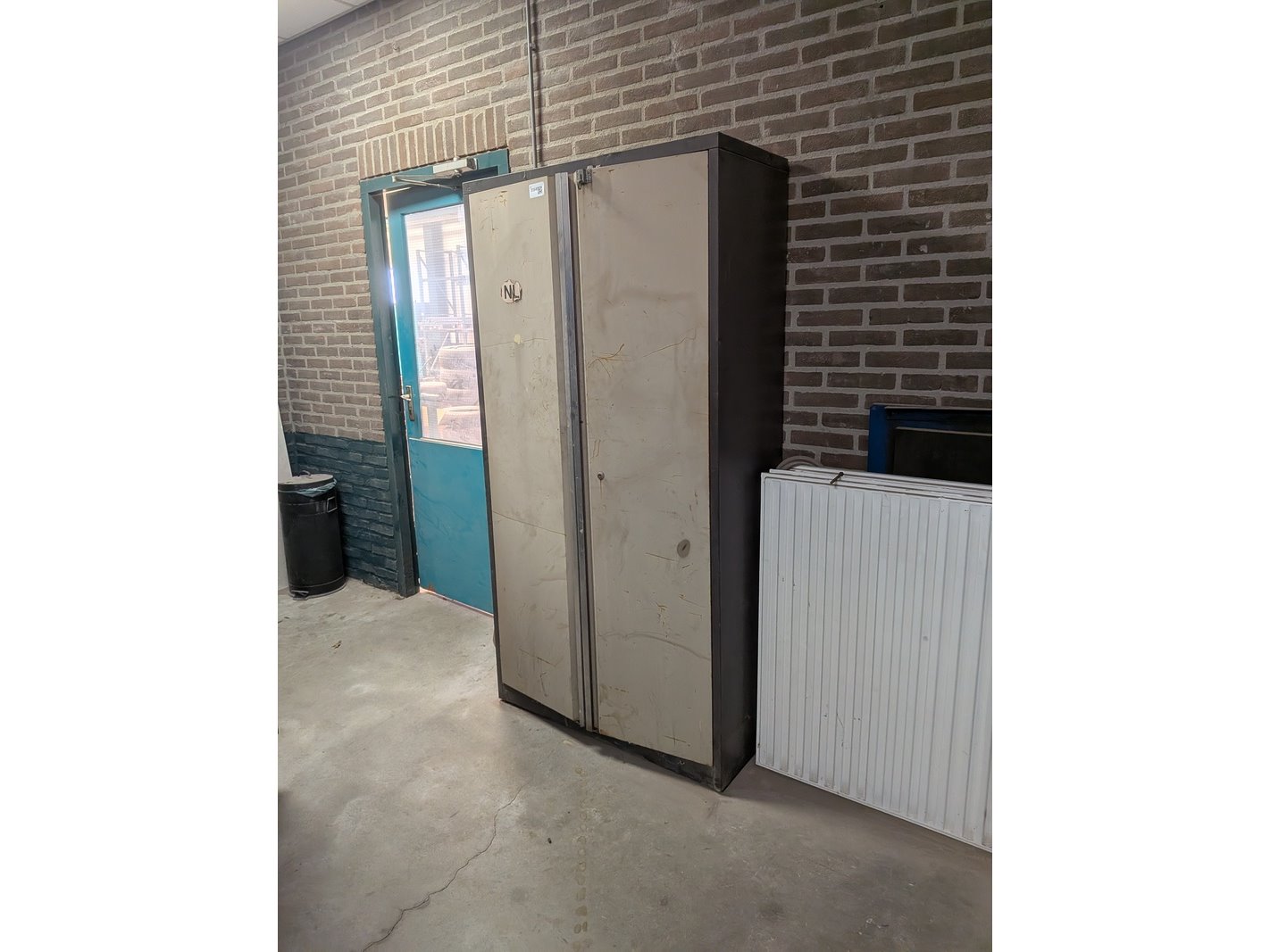 Product: Werkplaatskast met inhoud Materiaal: metaal Afmeting: hxbxd ca. 196 x 100 x 45 cm Conditie: gebruikt