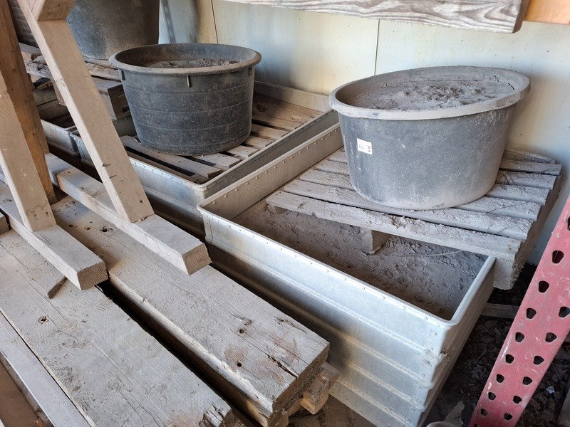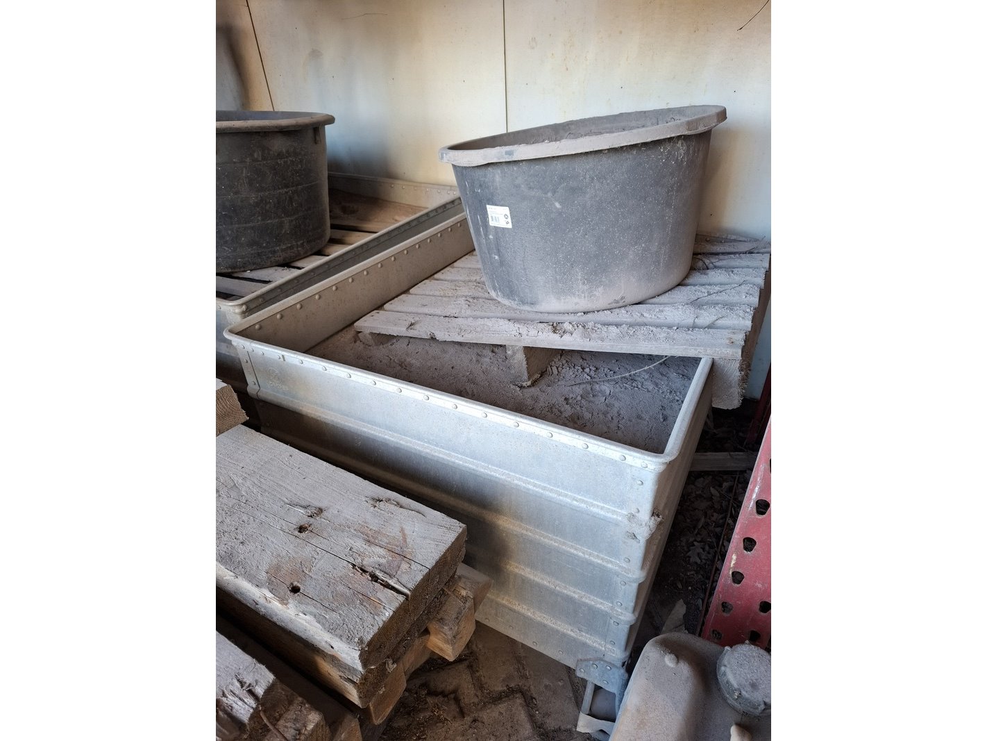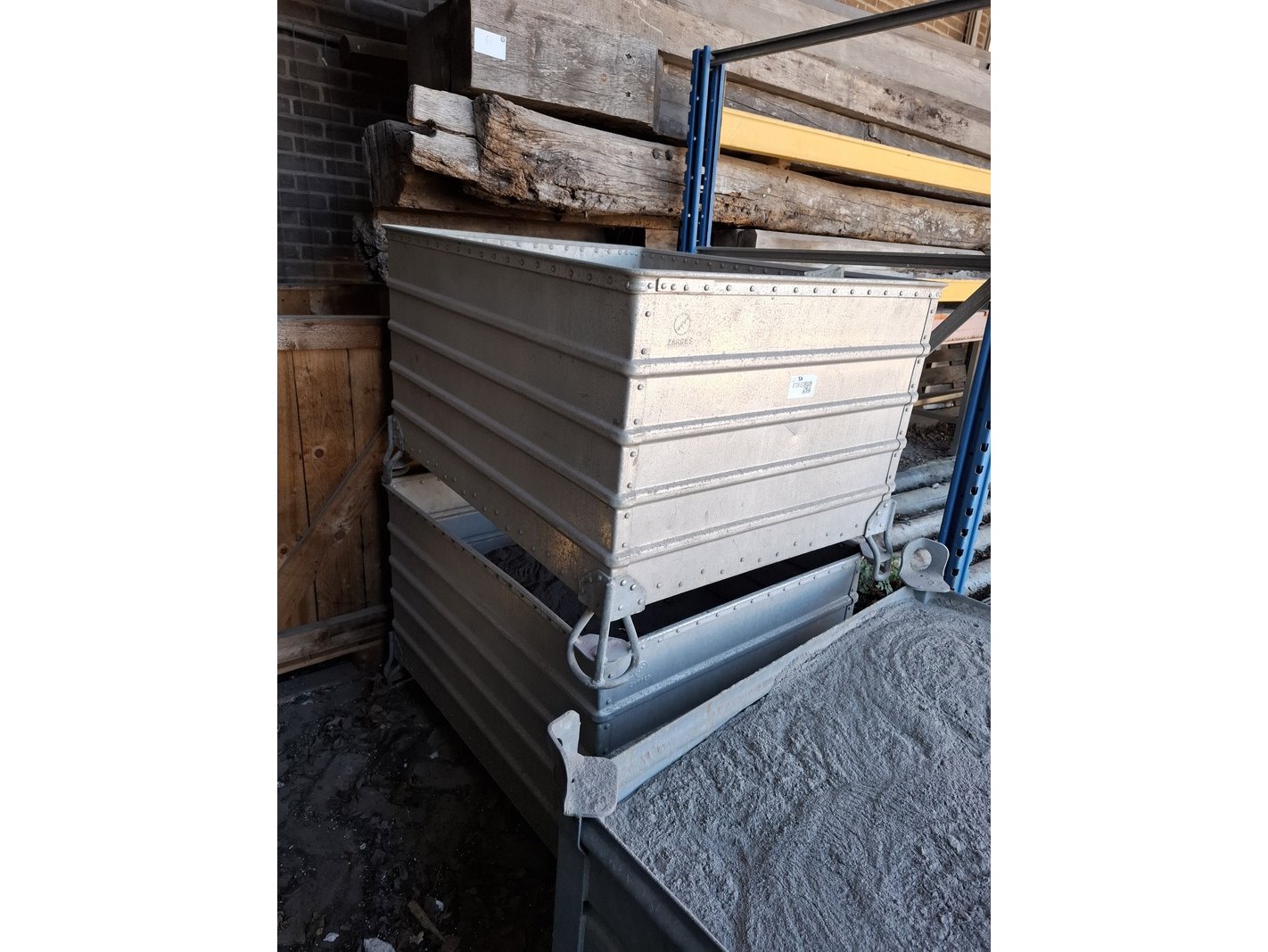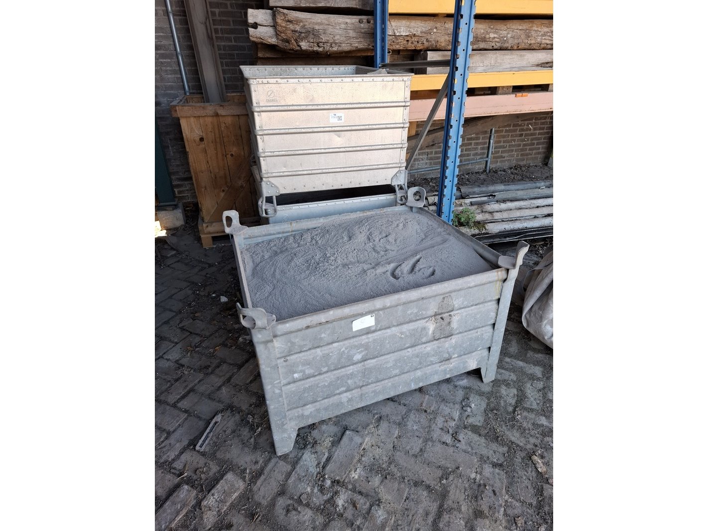 Product: Stapelbak Materiaal: Metaal Afmeting: 5x lxbxh ca. 100x78x53, 1x 100x80x60 cm Conditie: gebruikt Specificaties: Inclusief inhoud, gevuld met straalzand