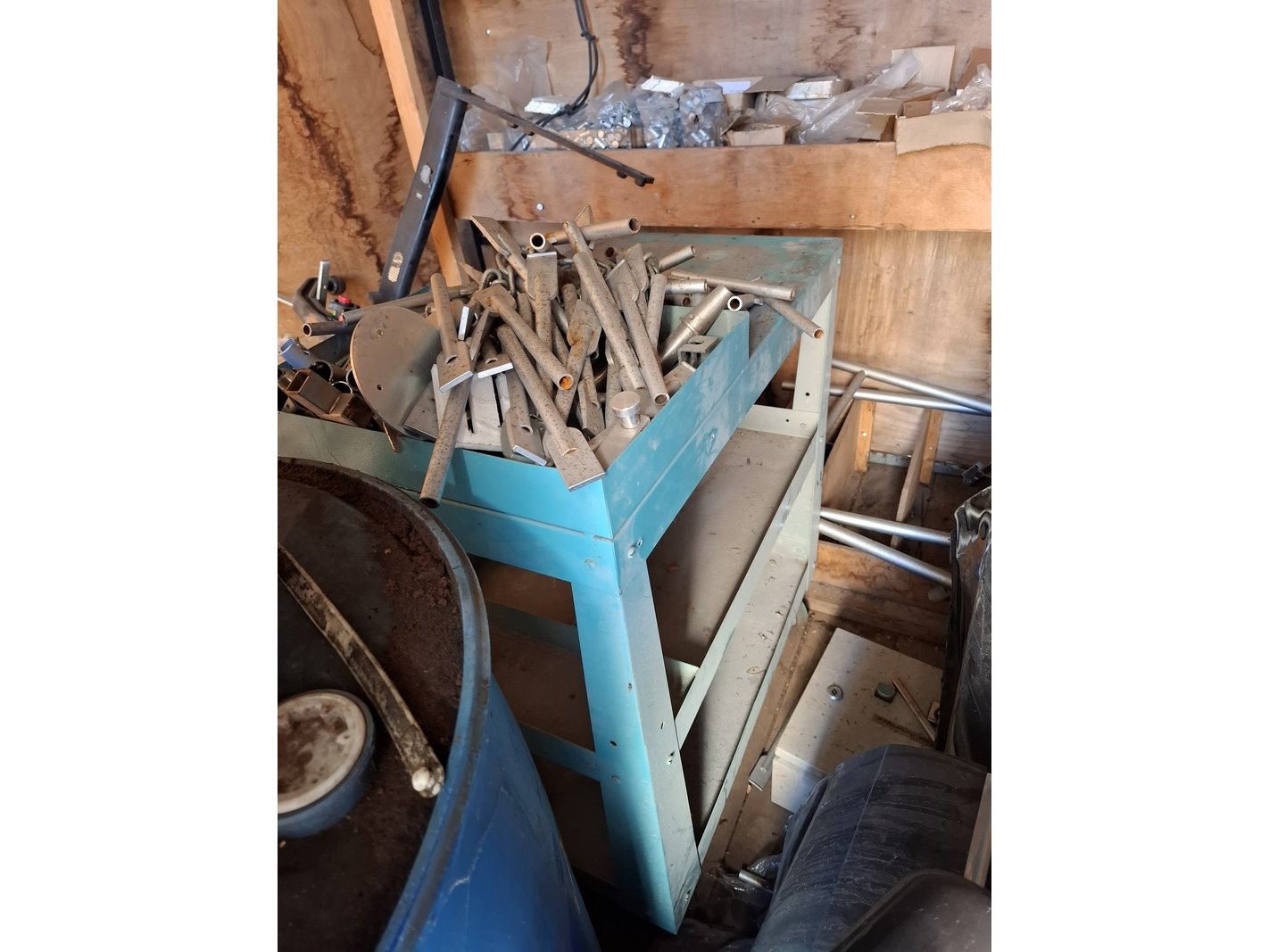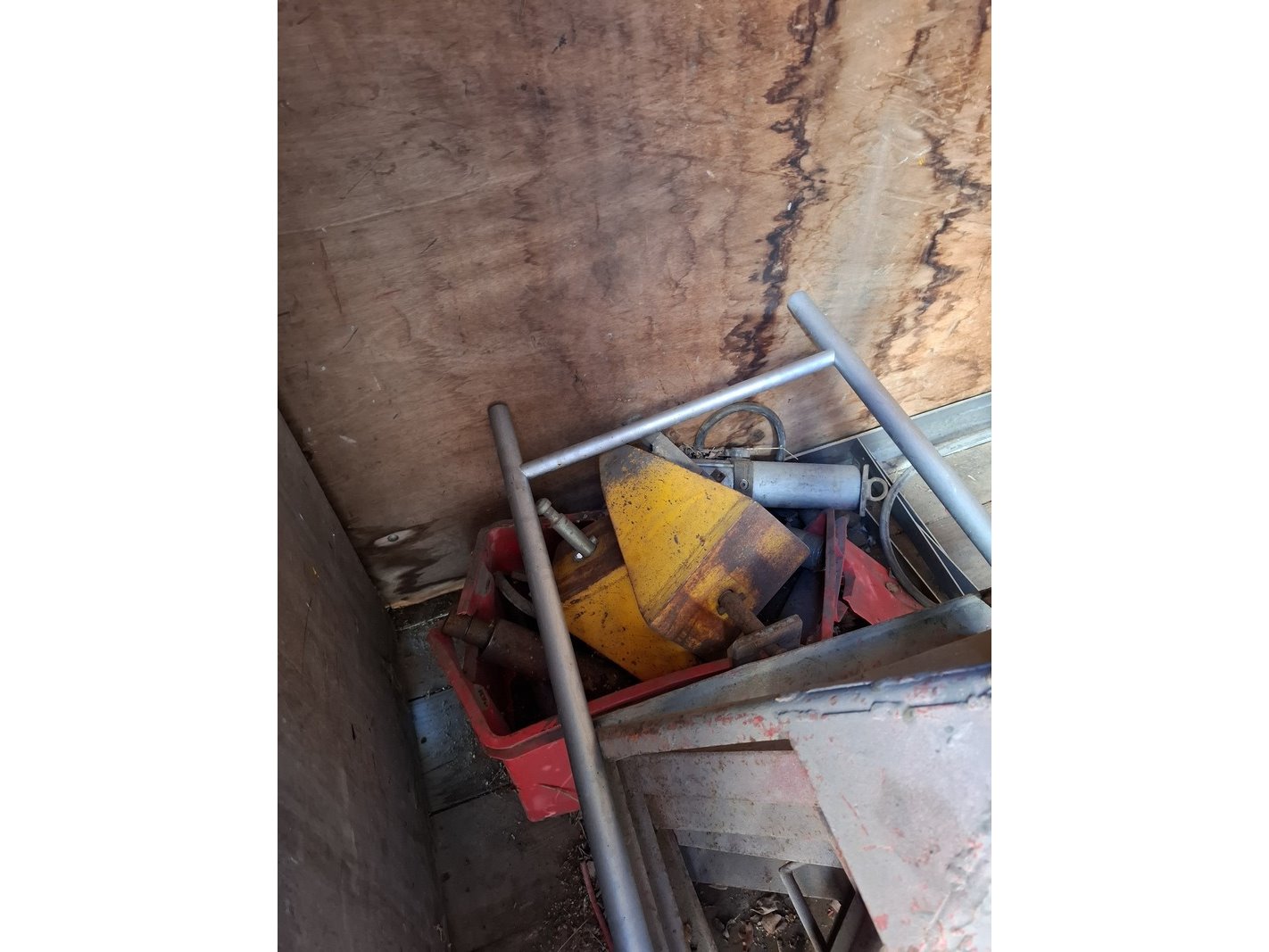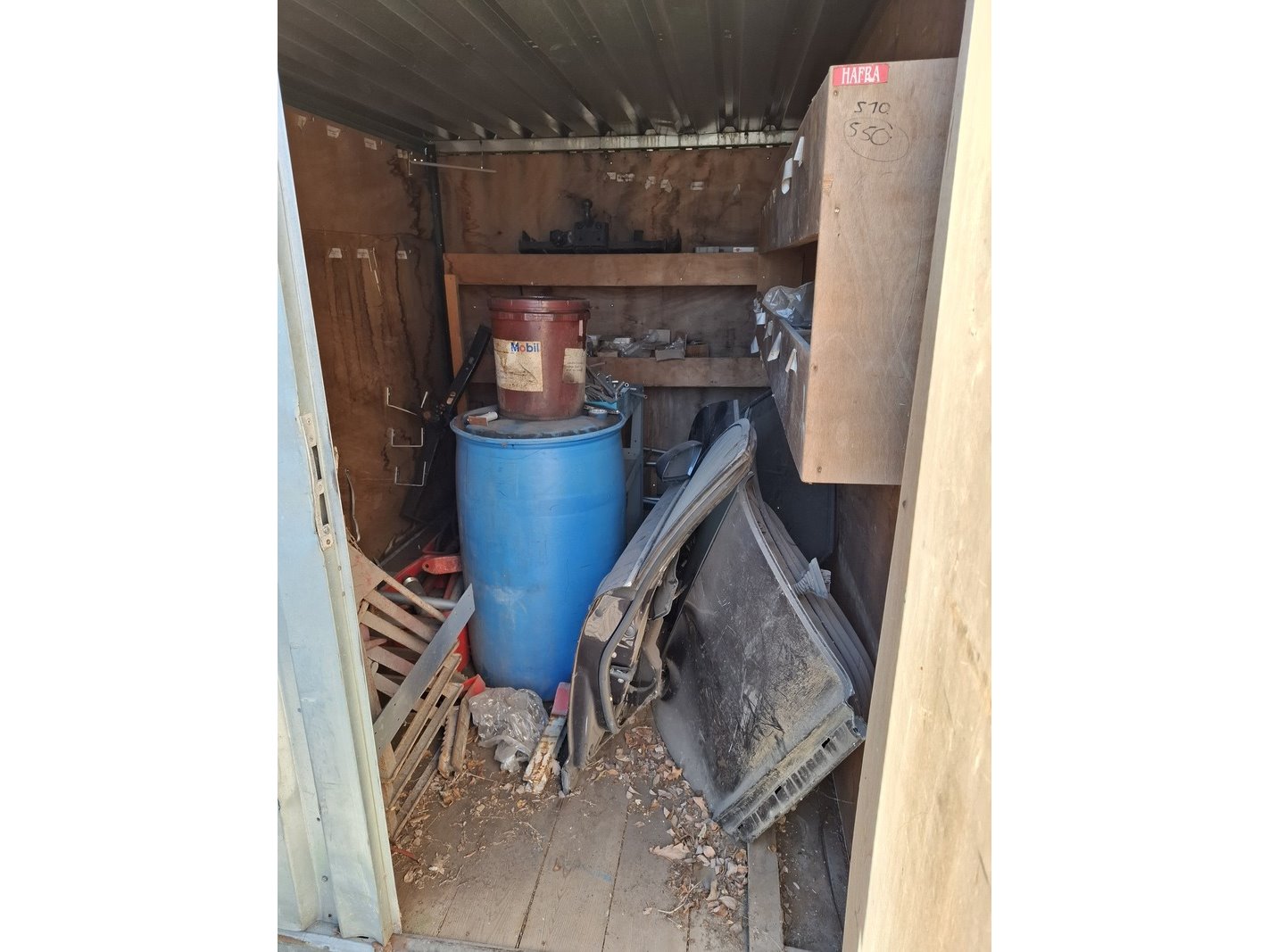 Product: Materiaal container Afmeting: lxbxh ca. 295 x 218 x 216 cm Conditie: gebruikt Specificaties: Inhoud bestaande uit o.a. metalen profielen, auto onderdelen, trekhaak unit, stempel materiaal, etc.
