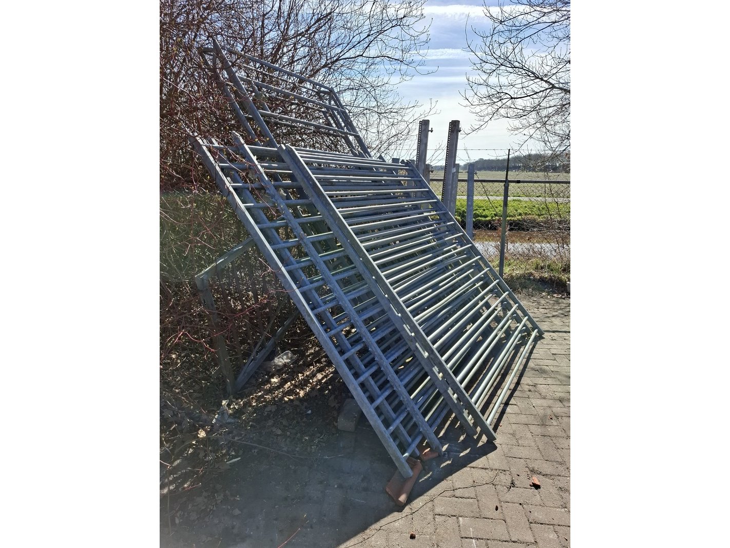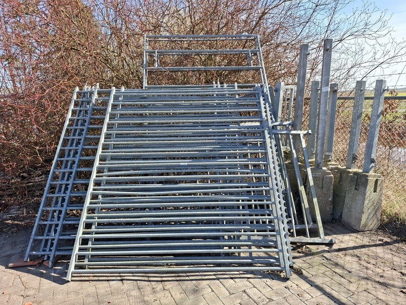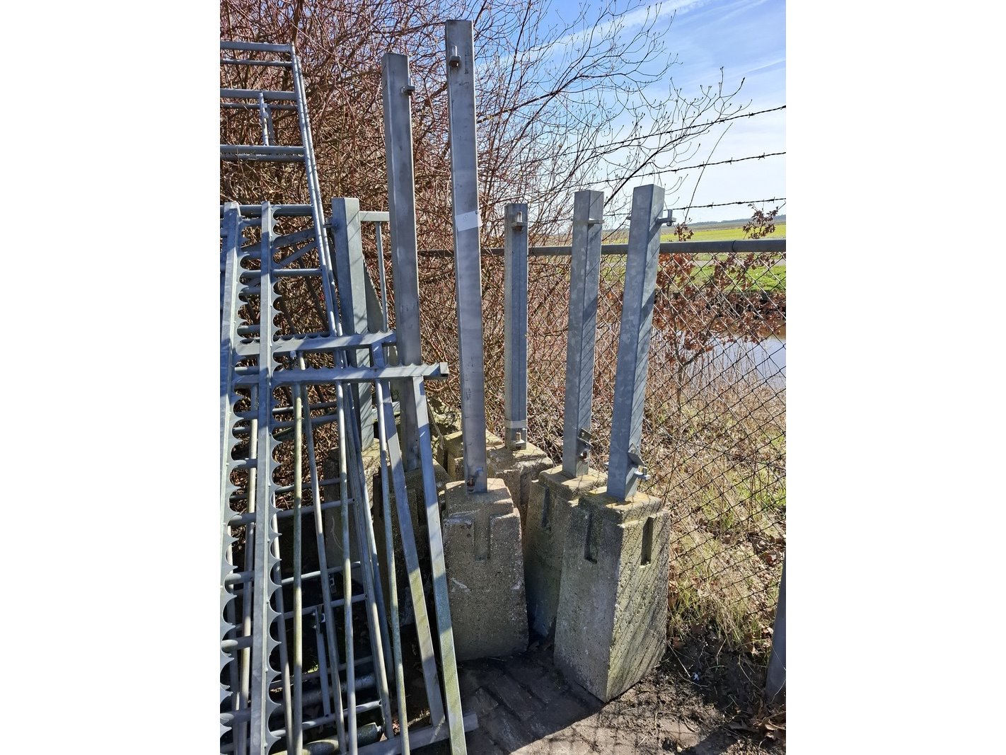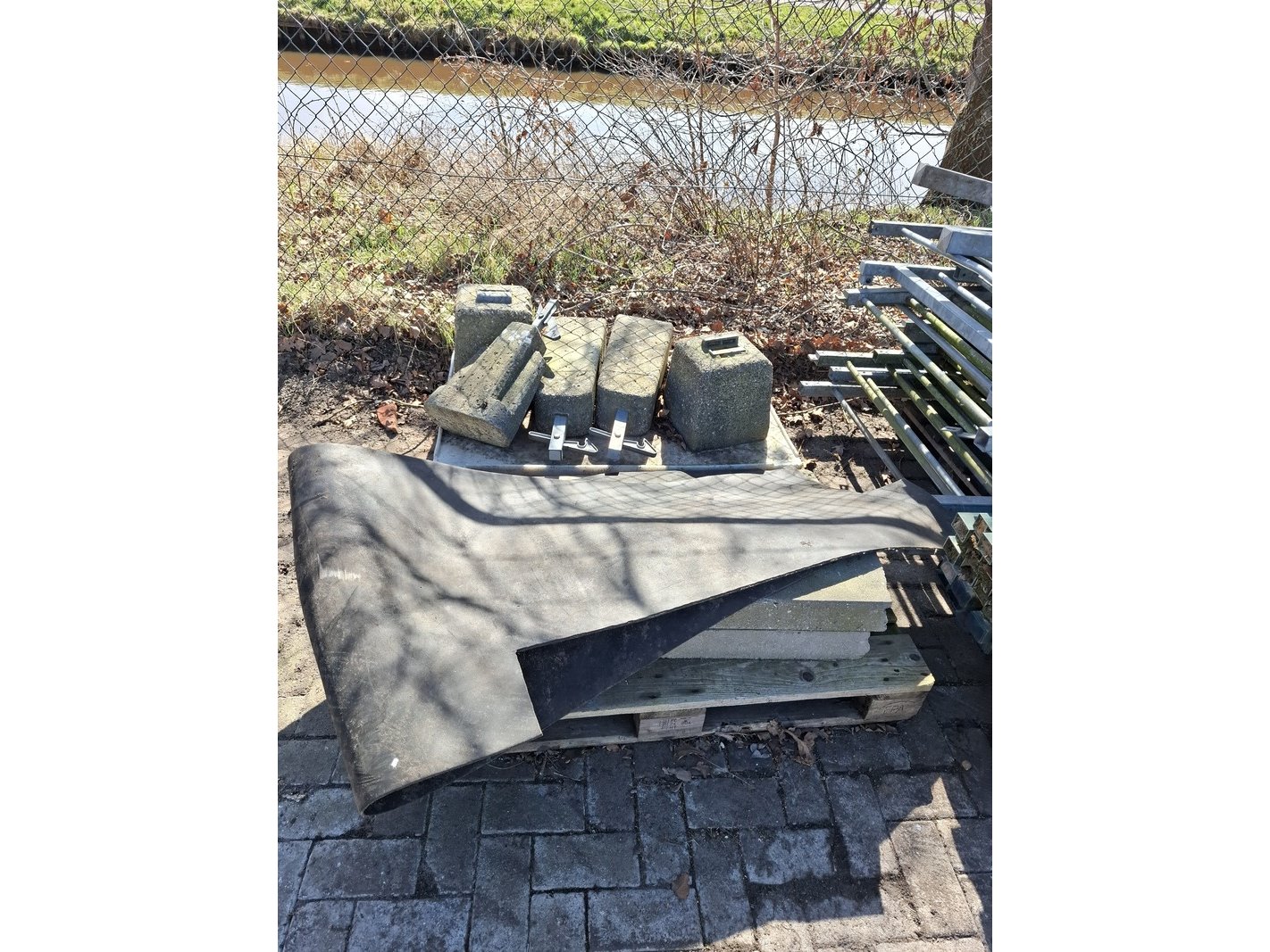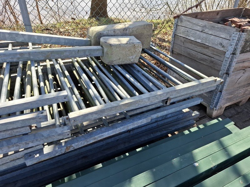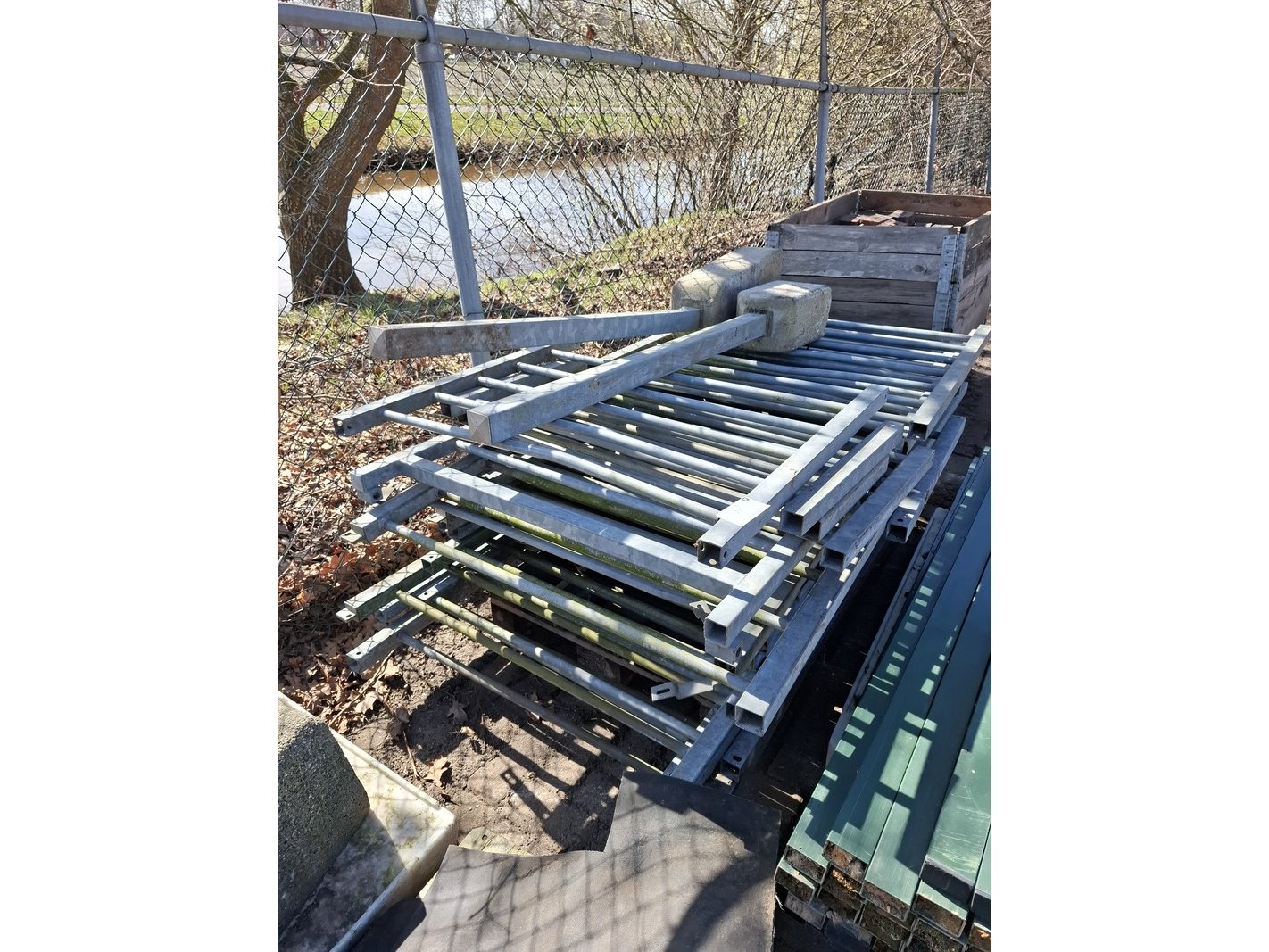 Product: Partij hekwerk Conditie: gebruikt Specificaties: Bestaande uit o.a.: Ca. 39x staander met betonnen poer, lengte ca. 170 cm Partij staanders (groen), lengte ca. 193 cm Diverse delen hekwerk, hart op hart hoogte ca. 90 cm 8x hekdeel, hoogte ca. 190 cm, breedte ca. 225 cm, Inclusief imperiaal, poort
