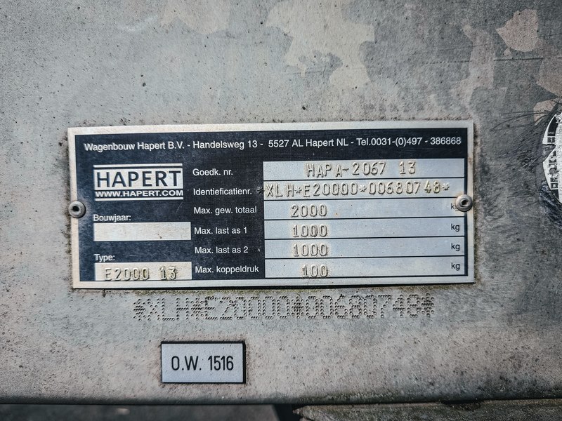 Merk: HAPERT Product: Kipper aanhangwagen BouwJaar: 2006 Conditie: Gebruikt Specificaties: Basiskenmerken Kenteken: WS-RV-14 Goedkeuringsnummer: HAPA-2067 13 Identificatienummer: XLH*E20000*00680748 Datum eerste toelating: 13 februari 2006 Maten & Gewichten Lengte voertuig: 4.420 mm Breedte voertuig: 1.660 mm Wielbasis: 750 mm Massa rijklaar: 665 kg Max. massa voertuig: 2.000 kg Laadvermogen: 1.335 kg