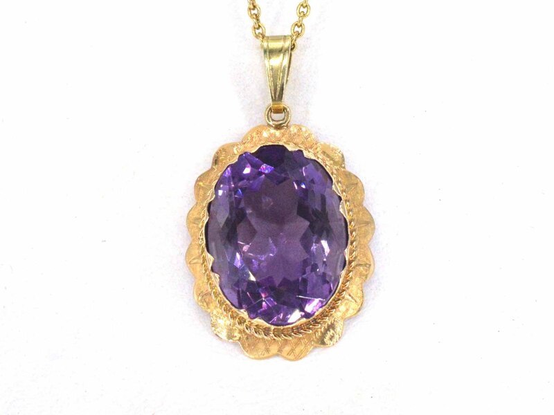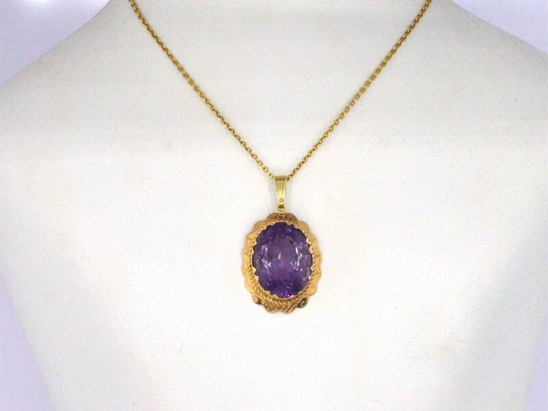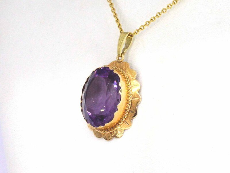 Product: Gouden hanger met een natuurlijke amethist Specificaties: Edelsteen: Amethist Slijpvorm: Ovaal gefacetteerd Gewicht (carat): 10.00 carat Kleur: Paars Zuiverheid: Hoge zuiverheidsgraad Juweel: Hanger (excl. ketting) Gewicht: 6 gram Materiaal: 14k goud (585) Conditie: Vintage Verpakking: Luxe sieradendoos Toelichting: De kwaliteit is overgenomen van het rapport behorend bij item. De waardebepaling is een beoordeling van een gecertificeerde diamantair, gebaseerd op consumentenprijzen. Consumentenprijs: € 5.775,-