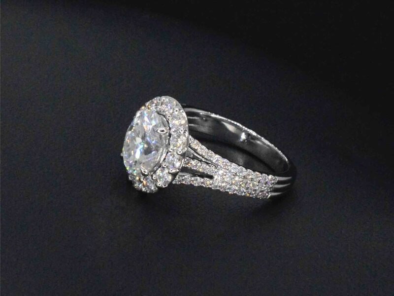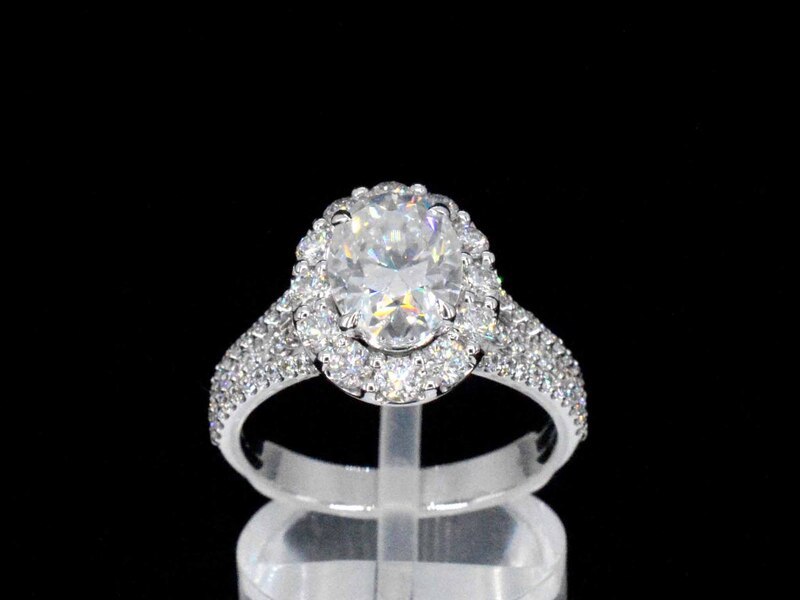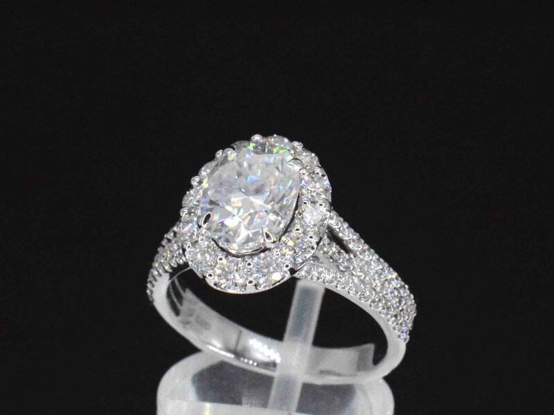 Product: Witgouden ring met diamanten en een 2.11 carat oval shape Specificaties: Diamant: Natuurlijk Aantal: 12 stuks Slijpvorm: Briljant geslepen Gewicht (carat): 0.62 carat Kleur: F Zuiverheid: VS Slijpkwaliteit: Zeer mooi Diamant (secundair): Diamanten Aantal diamanten: 66 stuks Slijpvorm: Briljant geslepen Gewicht (carat): 0.42 carat Kleur: F Zuiverheid: VS Slijpkwaliteit: Very Good Edelsteen: Moissaniet Slijpvorm: Ovaal geslepen Gewicht (carat): 2.11 carat Kleur: F Zuiverheid: VS Slijpkwaliteit: Very good Juweel: Ring Gewicht: 6.9 gram Ringmaat (op maat gemaakt*): 54 (17.25 mm) Materiaal: 18k goud (750) Conditie: Nieuw Verpakking: Luxe sieradendoos Toelichting: De kwaliteit is overgenomen van het rapport behorend bij item. De waardebepaling is een beoordeling van een gecertificeerde diamantair, gebaseerd op consumentenprijzen. Consumentenprijs: € 6.930,-