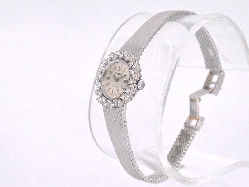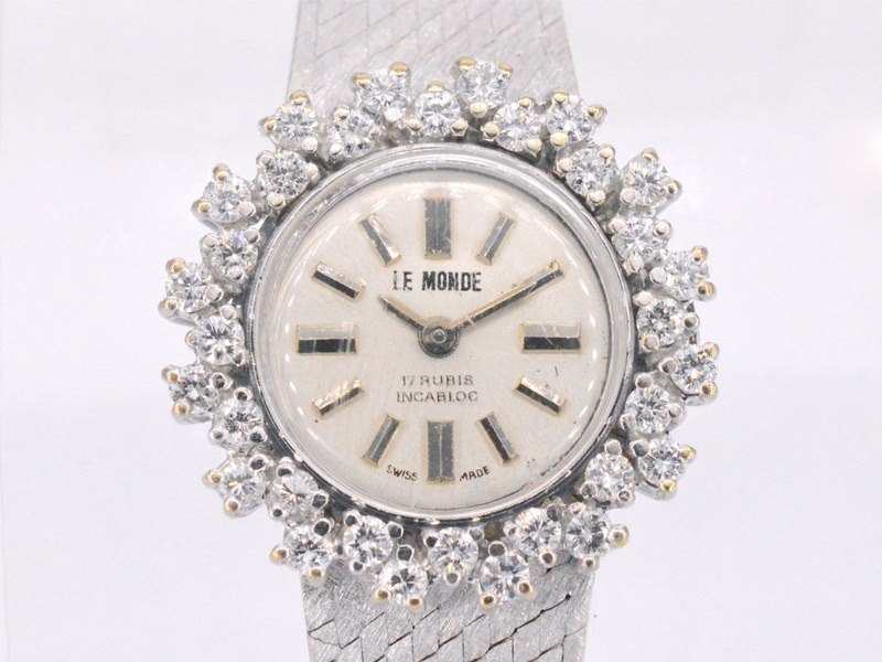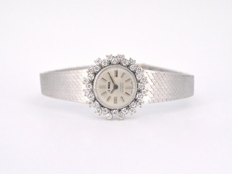 Product: Le monde dameshorloge met diamanten Specificaties: Diamant: Natuurlijk Aantal: 32 stuks Slijpvorm: Briljant geslepen Gewicht (carat): 1.50 carat Kleur: F-G Zuiverheid: VS Slijpkwaliteit: Zeer mooi Horloge (Merk): Le monde Juweel: Horloge Gewicht: 35.9 gram Materiaal: 18K goud (750) Conditie: Vintage Toelichting: De kwaliteit is overgenomen van het rapport behorend bij item. De waardebepaling is een beoordeling van een gecertificeerde diamantair, gebaseerd op consumentenprijzen. Consumentenprijs: € 25.725,-
