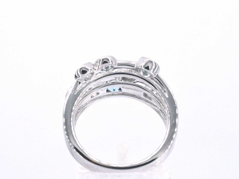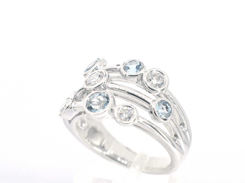 Product: Witgouden design ring met aquamarijn en diamant Specificaties: Aantal: 4 stuks Slijpvorm: Briljant geslepen Gewicht (carat): 0.60 carat Kleur: F-G Zuiverheid: VS Slijpkwaliteit: Zeer mooi Edelsteen: Aquamarijn Aantal: 5 stuks Slijpvorm: Briljant geslepen Gewicht (carat): 0.75 carat Kleur: licht blauw Zuiverheid: Met natuurlijke insluitsels Juweel: Ring Gewicht: 8.6 gram Ringmaat (op maat gemaakt*): 53 (17 mm) Materiaal: 18K goud (750) Conditie: Nieuw Verpakking: Luxe sieradendoos Toelichting: De kwaliteit is overgenomen van het rapport behorend bij item. De waardebepaling is een beoordeling van een gecertificeerde diamantair, gebaseerd op consumentenprijzen. Consumentenprijs: € 8.733,-