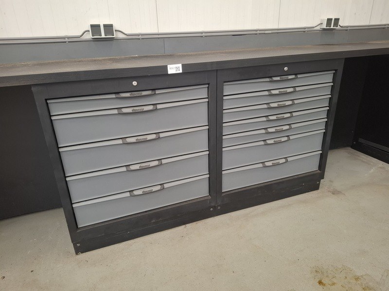 Merk: Boxo Product: Werkbank met ladekasten Materiaal: hout/metaal Afmeting: hxbxd ca 100x930x70cm Conditie: gebruikt Specificaties: voorzien van 2 2-deurskasten en 4 ladekasten Boxo
