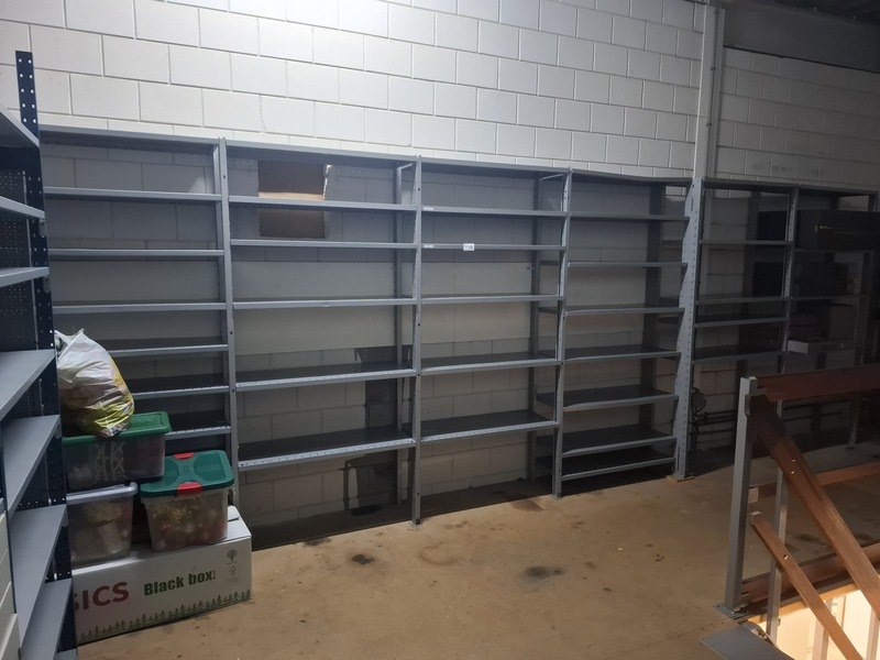 Product: Metalen stelling Afmeting: totale hxbxd ca 218x1200x40cm Conditie: gebruikt