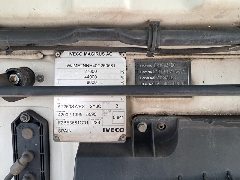 Merk: IVECO Product: Vuilniswagen BouwJaar: 2013 Conditie: Gebruikt Specificaties: Basis kenmerken Kenteken: 45-BBP-7 Chassisnummer (VIN): WJME2NNH40C260581 Datum eerste toelating: 8 maart 2013 Vervaldatum APK: 18 maart 2026 Afgelezen tellerstand: 169.248 km Aantal sleutels: 2 Motor, Prestaties & Milieu Brandstof: diesel Motorcode: F2BE3681C*U Aantal cilinders: 6 Cilinderinhoud: 7.790 cm³ Max. vermogen: 228 kW / 310 pk Transmissie: automatisch Emissiecode: Euro 5 Maten & Gewichten Voertuig lengte: 9.300 mm Voertuig breedte: 2.550 mm Wielbasis: 5.600 mm Massa rijklaar: 13.160 kg Max. massa voertuig: 27.000 kg Laadvermogen: 13.940 kg
