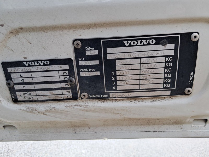 Merk: Volvo Product: Vrachtwagen BouwJaar: 2011 Specificaties: Basis kenmerken Kenteken: BZ-NS-86 Chassisnummer (VIN): YV2J1D1CXCB604963 Datum eerste toelating: 1 november 2011 Vervaldatum APK: 1 november 2026 Afgelezen tellerstand: 385.692 km Motor, Prestaties & Milieu Brandstof: diesel Motorcode: D11C330 EEV Aantal cilinders: 6 Cilinderinhoud: 10.837 cm³ Max. vermogen: 248 kW / 337 pk Transmissie: automatisch Emissiecode: Euro 6 Maten & Gewichten Voertuig lengte: 8.300 mm Voertuig breedte: 2.550 mm Wielbasis: 5.670 mm Massa rijklaar: 11.465 kg Max. massa voertuig: 28.000 kg Laadvermogen: 16.635 kg