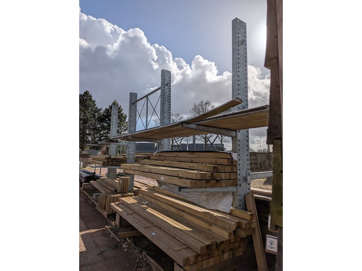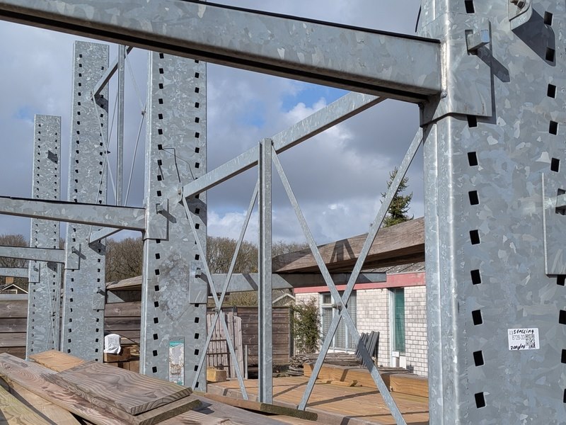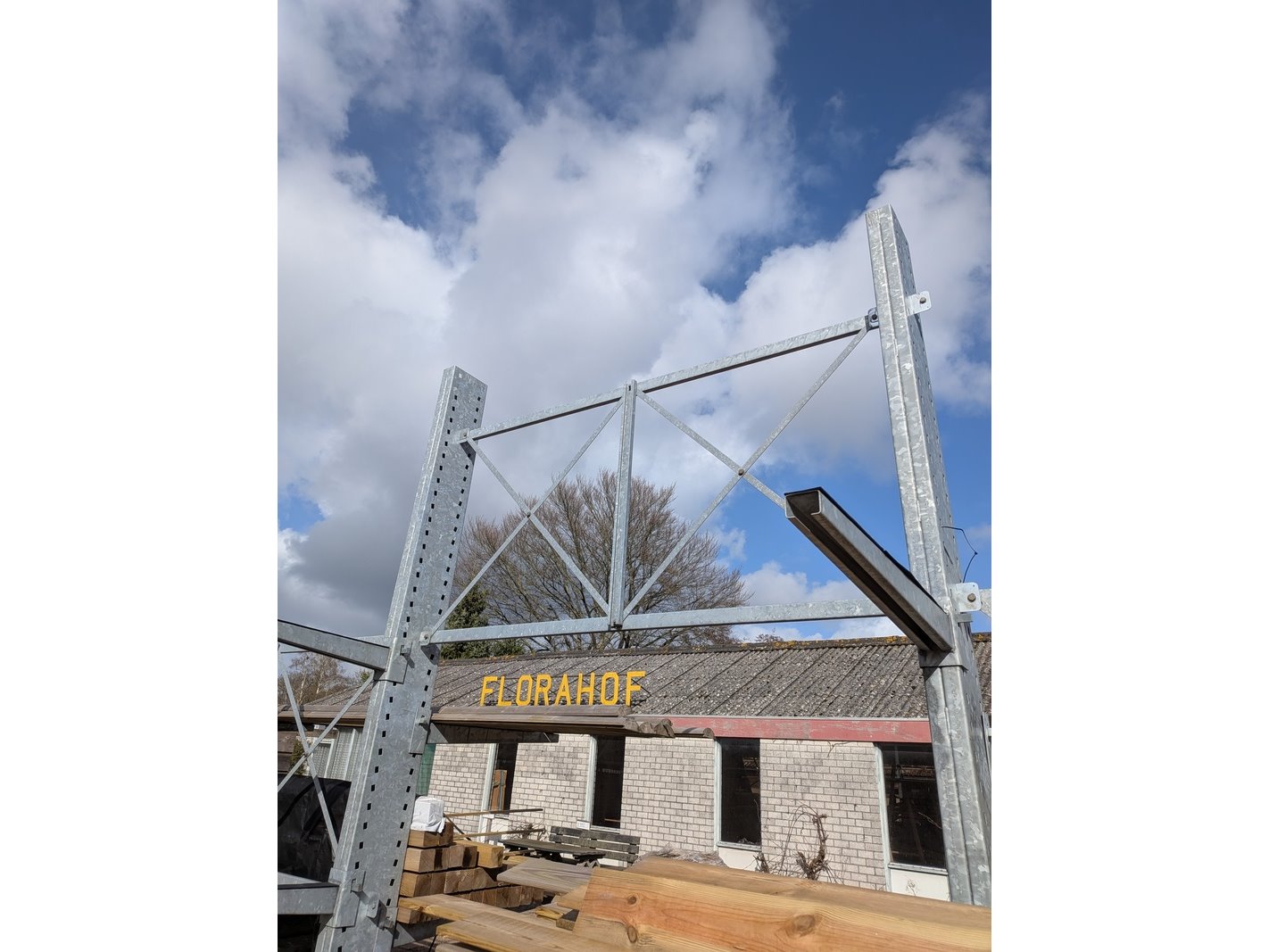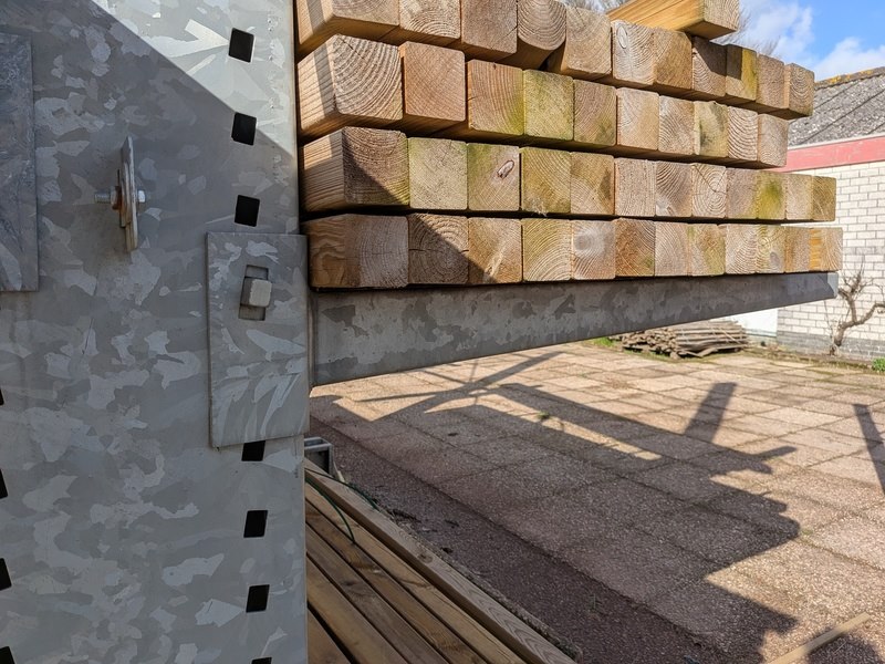 Product: Draagarmstelling Specificaties: 4x staander, hoogte ca. 400 cm, 16x ligger, lengte ca. 100 cm.