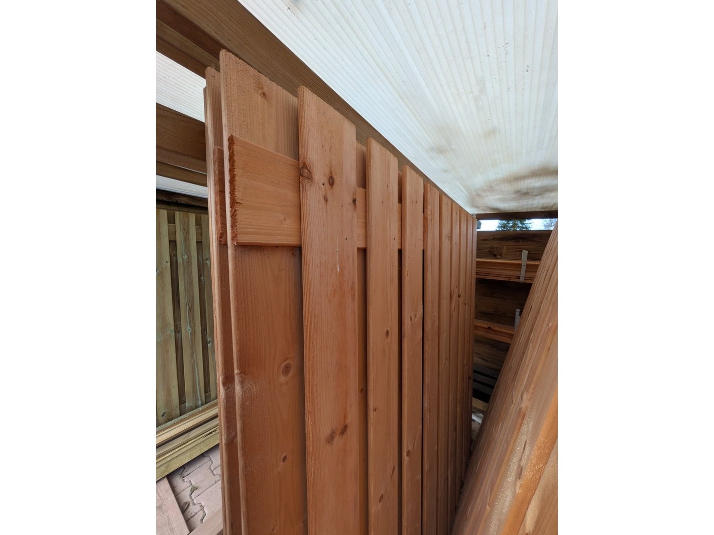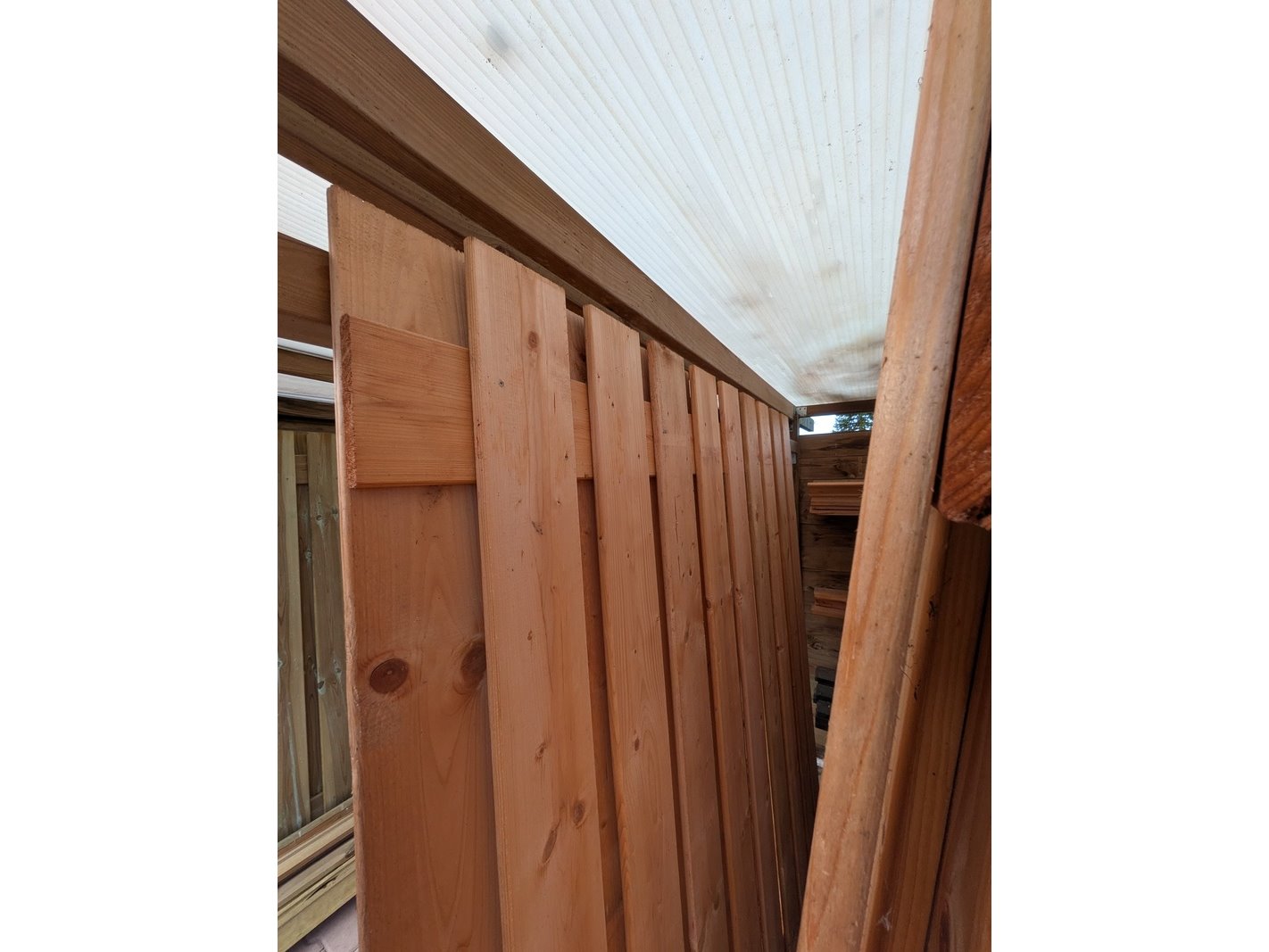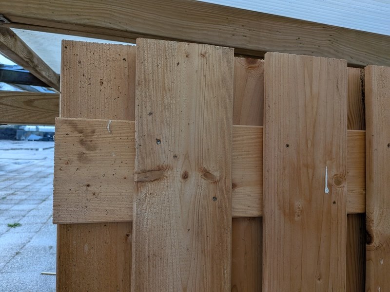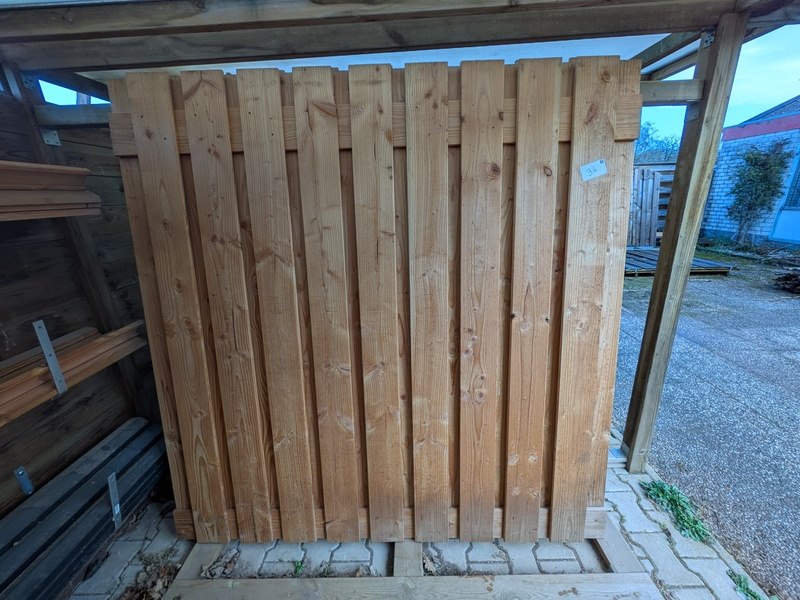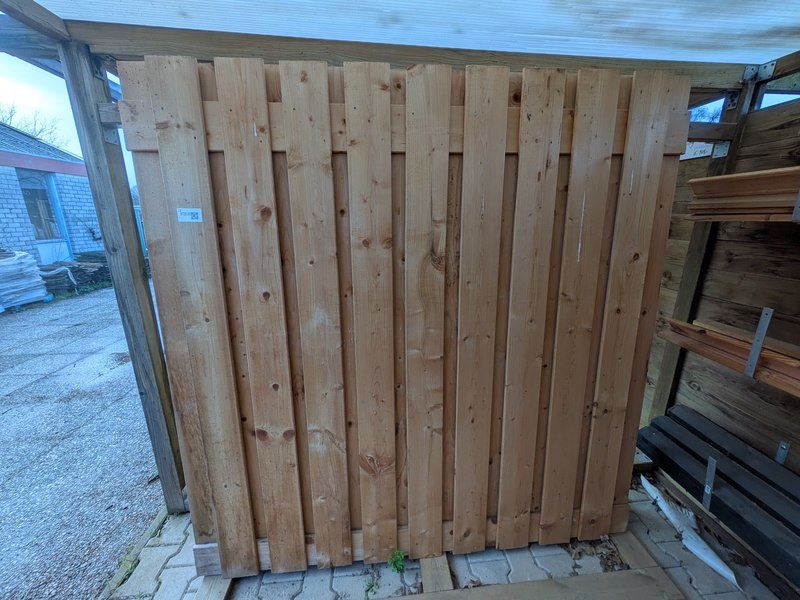Product: Schuttingdeel Afmeting: Ca. 180x180 cm Specificaties: 5x Douglas en 2x Red Class. 14x Afdeklat, Douglas, 7x afdeklat, Red Class en 12x afdeklat, zwart.