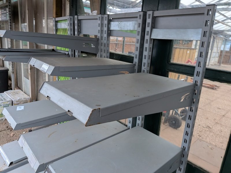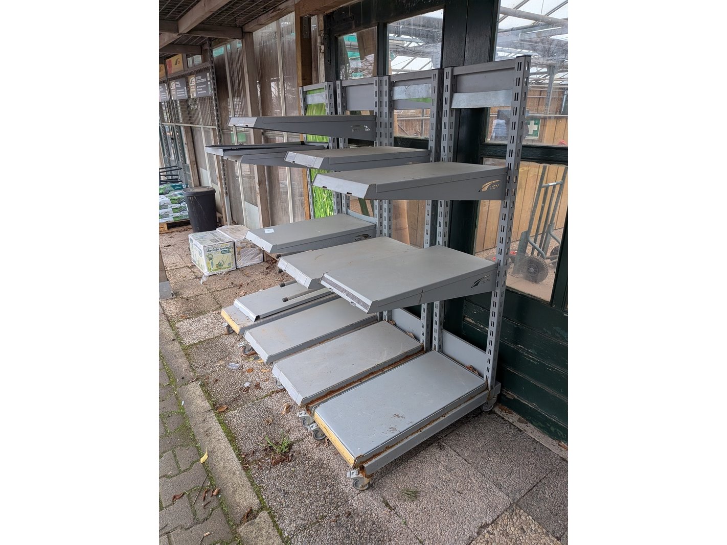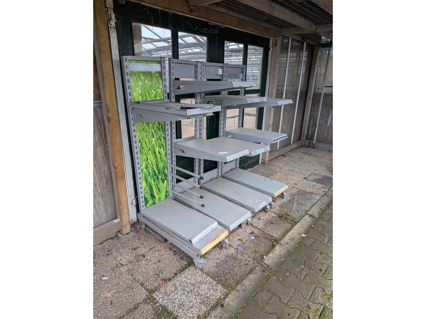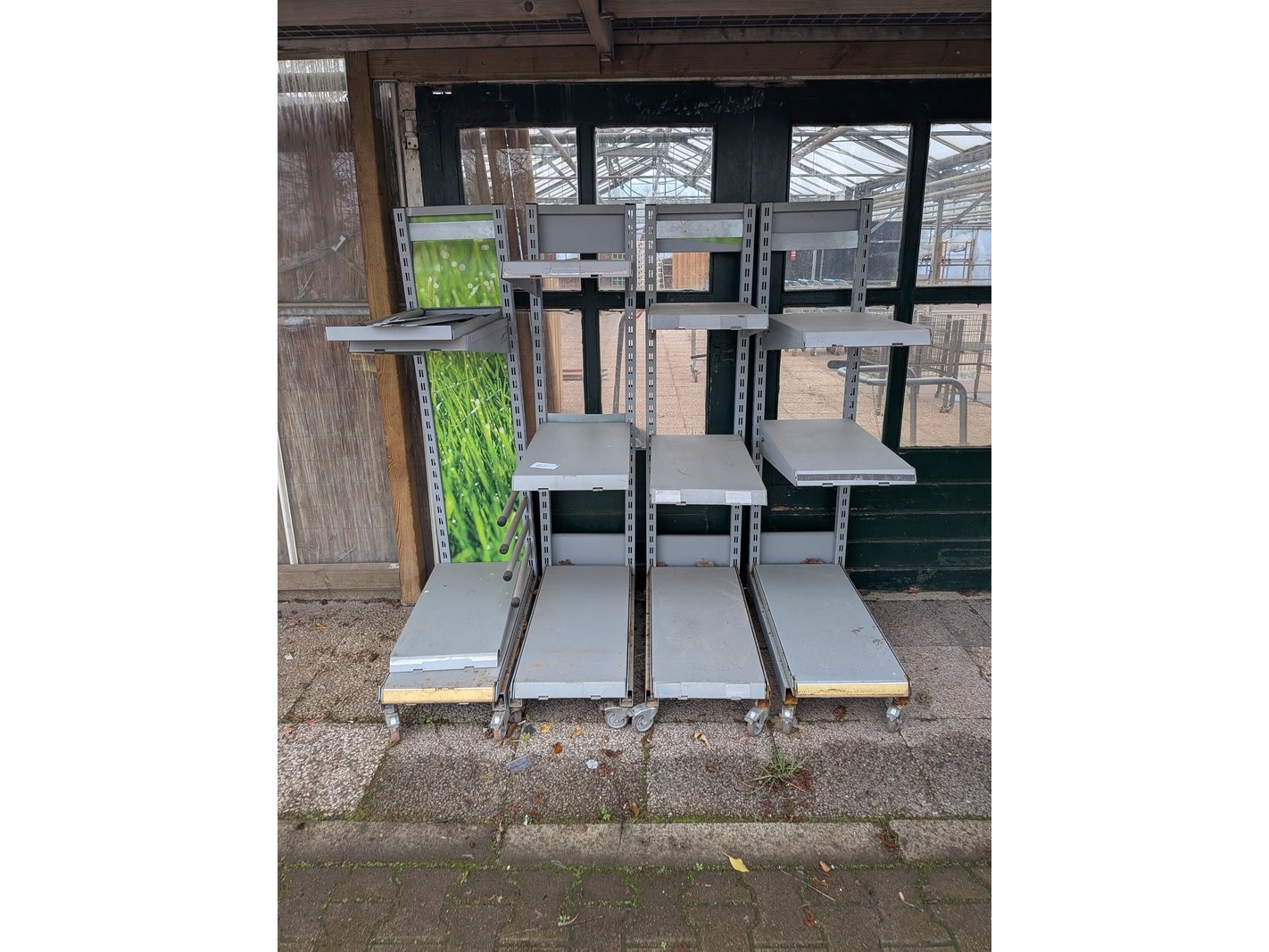 Product: Winkelstelling Specificaties: 1x hxbxd ca. 218x300x60 cm, 4x hxbxd ca. 160x39x84 cm, verrijdbaar. Inclusief diverse presentatie meubels.