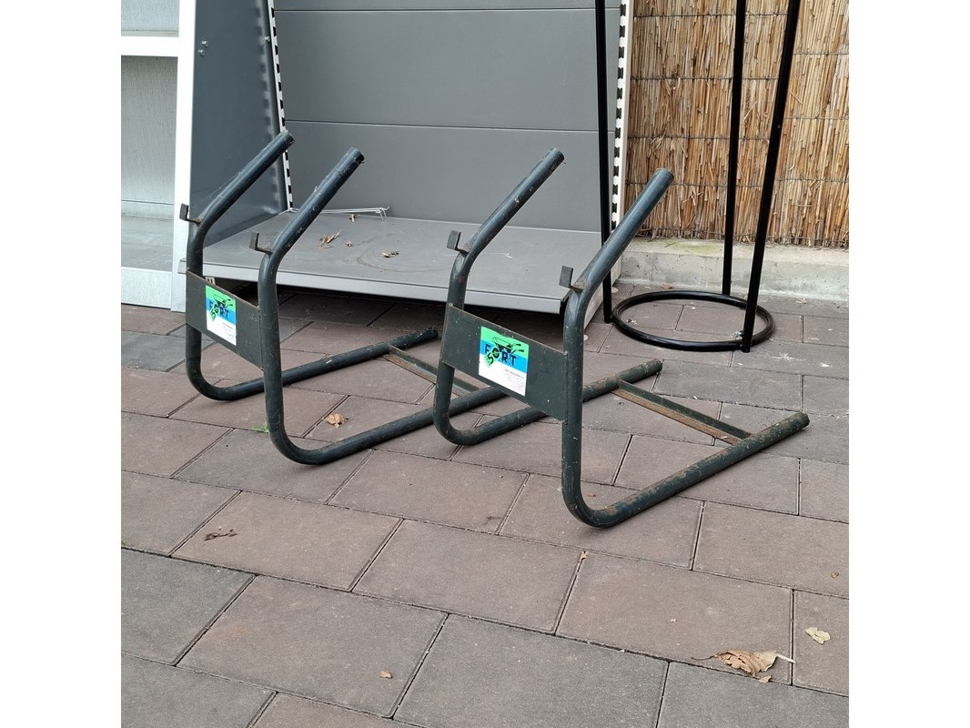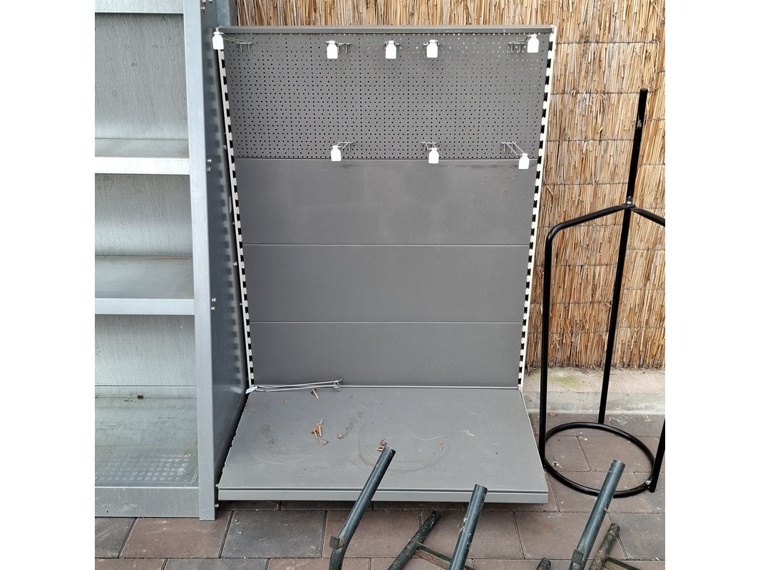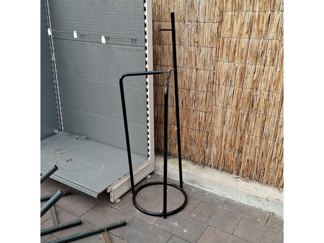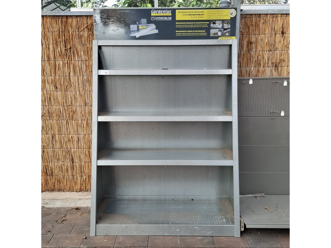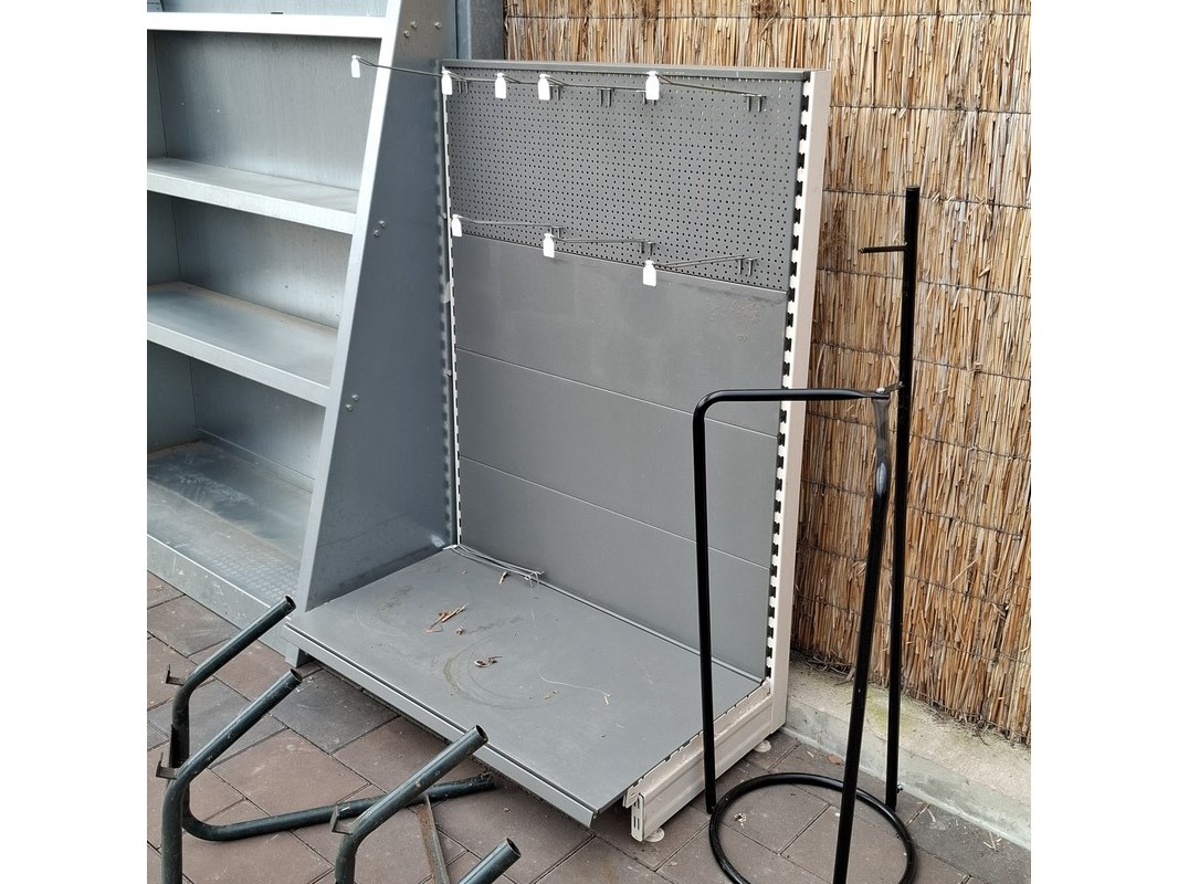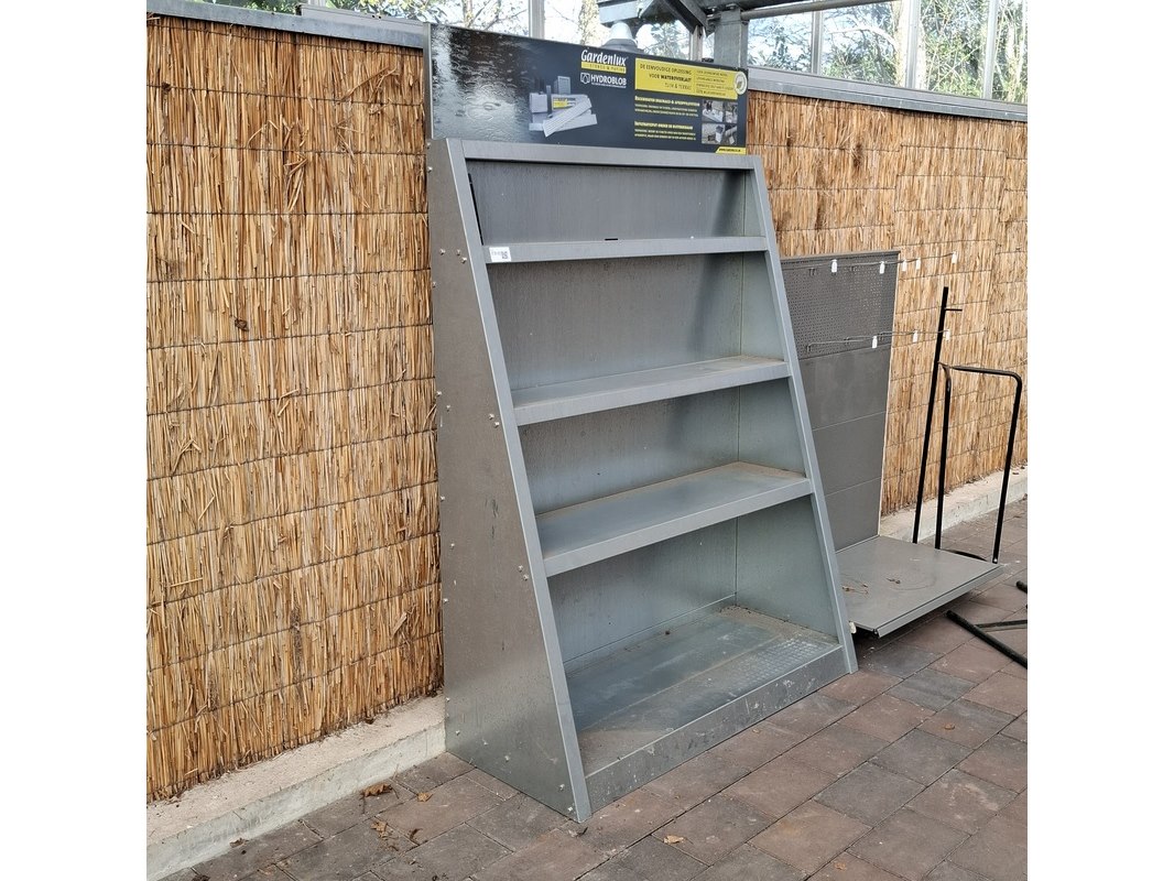 Product: Presentatiemeubel en 1x stelling Materiaal: Metaal Specificaties: 2x kruiwagenstandaard, 1x kruiwagenbanden standaard, 1x presentatiemeubel hxbxd ca. 221x140x58 cm, 1x stelling hxbxd ca. 144x103x65 cm