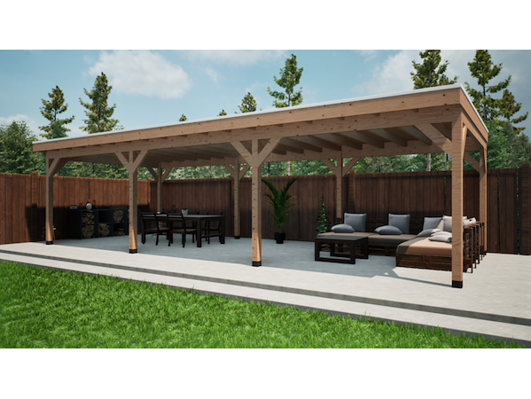 Merk: Verando Product: Douglas overkapping, 402 x 981 cm Materiaal: Douglas Conditie: nieuw Specificaties: De Verando Pure Douglas overkapping is een bouwpakket van fijn bezaagd Europees Douglas hout. Deze overkapping heeft een overstek. Het bouwpakket is al op maat gezaagd en wordt geleverd als een compleet pakket inclusief bevestigingsmaterialen en een duidelijke, stapsgewijze handleiding voor de montage. Het pakket bestaat uit: - Palen van 12 x 12 cm; - Een ringbalk van 5 x 15 cm; - Een balklaag van 5 x 15 cm; - Dakbeschot van 1,8 cm dik; - Boeiboorden van 2,2 x 20 cm; - Schoren van 5 x 15 cm; - Alle benodigde bevestigingsmaterialen; - Heldere en gebruiksvriendelijke montagehandleiding. De laatste afbeelding is ter illustratie van de houtkwaliteit. Totale hoogte: 260 cm Doorloop hoogte: 224 cm