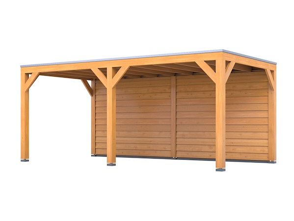 Merk: Verando Product: Douglas overkapping, 407 x 783 cm + wand blank, Materiaal: Douglas Conditie: nieuw Specificaties: De Verando Living Douglas overkapping is een bouwpakket van fijn bezaagd Europees Douglas hout. Het bouwpakket is al op maat gezaagd en wordt geleverd als een compleet pakket inclusief bevestigingsmaterialen en een duidelijke, stapsgewijze handleiding voor de montage. Het pakket bestaat uit: - Palen van 15 x 15 cm; - Een ringbalk van 5 x 20 cm; - Een balklaag van 5 x 15 cm; - Dakbeschot van 1,8 cm dik; - Schoren van 5 x 15 cm; - Achterwand van blank douglas Zweeds rabat; - Alle benodigde bevestigingsmaterialen; - Heldere en gebruiksvriendelijke montagehandleiding. De laatste afbeelding is ter illustratie van de houtkwaliteit. Totale hoogte: 260 cm Doorloop hoogte: 224 cm