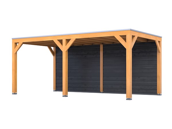 Merk: Verando Product: Douglas overkapping, 407 x 583 cm + wand zwart, Materiaal: Douglas Conditie: nieuw Specificaties: De Verando Living Douglas overkapping is een bouwpakket van fijn bezaagd Europees Douglas hout. Het bouwpakket is al op maat gezaagd en wordt geleverd als een compleet pakket inclusief bevestigingsmaterialen en een duidelijke, stapsgewijze handleiding voor de montage. Het pakket bestaat uit: - Palen van 15 x 15 cm; - Een ringbalk van 5 x 20 cm; - Een balklaag van 5 x 15 cm; - Dakbeschot van 1,8 cm dik; - Schoren van 5 x 15 cm; - Achterwand van zwart douglas Zweeds rabat; - Alle benodigde bevestigingsmaterialen; - Heldere en gebruiksvriendelijke montagehandleiding. De laatste afbeelding is ter illustratie van de houtkwaliteit. Totale hoogte: 260 cm Doorloop hoogte: 224 cm