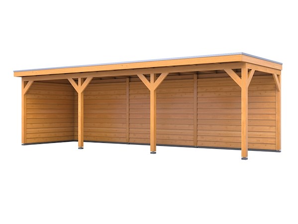 Merk: Verando Product: Douglas overkapping, 302 x 735 cm + wanden blank, Materiaal: Douglas Conditie: nieuw Specificaties: De Verando Pure Douglas overkapping is een bouwpakket van fijn bezaagd Europees Douglas hout. Deze overkapping heeft een overstek. Het bouwpakket is al op maat gezaagd en wordt geleverd als een compleet pakket inclusief bevestigingsmaterialen en een duidelijke, stapsgewijze handleiding voor de montage. Het pakket bestaat uit: - Palen van 12 x 12 cm; - Een ringbalk van 5 x 15 cm; - Een balklaag van 5 x 15 cm; - Dakbeschot van 1,8 cm dik; - Boeiboorden van 2,2 x 20 cm; - Schoren van 5 x 15 cm; - Zij- en achterwand van blank douglas Zweeds rabat; - Alle benodigde bevestigingsmaterialen; - Heldere en gebruiksvriendelijke montagehandleiding. De laatste afbeelding is ter illustratie van de houtkwaliteit. Totale hoogte: 260 cm Doorloop hoogte: 224 cm