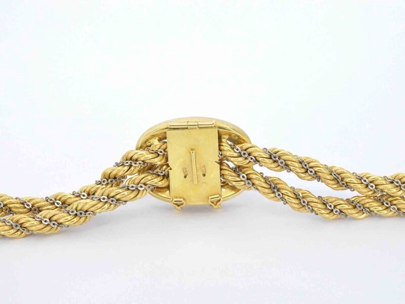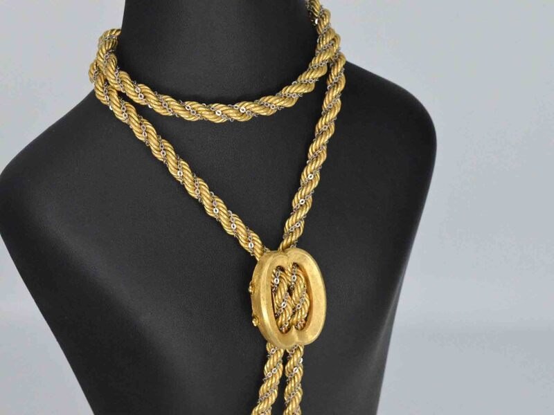Product: Gouden halsketting met een speciale gouden sluiting Specificaties: Juweel: Collier Gewicht: 117.8 gram Afmetingen/lengte: 110 cm (verstelbare sluiting) Materiaal: 18K goud (750) Conditie: Zo goed als nieuw Verpakking: Luxe sieradendoos Toelichting: De kwaliteit is overgenomen van het rapport behorend bij item. De waardebepaling is een beoordeling van een gecertificeerde diamantair, gebaseerd op consumentenprijzen. Extra informatie: sluiting verstelbaar Consumentenprijs: € 68.200,-