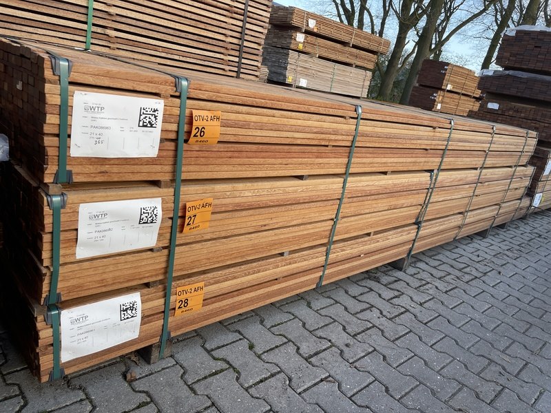 Product: Angelim Pedra Latten Geschaafd Materiaal: Makka Kabbes Afmeting: 21x40mm, lengte 425cm Conditie: nieuw